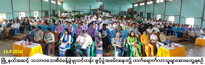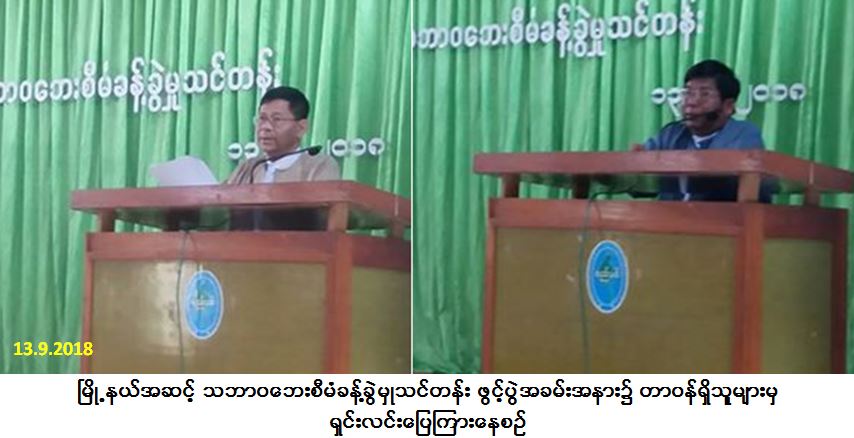 ရှမ်းပြည်နယ်ဦးစီးမှူးရုံးမှတာဝန်ရှိသူများနှင့် ရှမ်းပြည်နယ်အစိုးရအဖွဲ့တို့ပူးပေါင်းကျင်းပသော မြို့နယ်အဆင့် သဘာဝဘေးစီမံခန့်ခွဲမှုသင်တန်းဖွင့်ပွဲအခမ်းအနားကို ကွန်ဟိန်းမြို့၊ နမ့်ပန်ခန်းမ၌ (၁၃-၉-၂၀၁၈) ရက်နေ့ နံနက်ပိုင်းတွင် ကျင်းပပြုလုပ်ခဲ့ရာ ဗမာတိုင်းရင်းသားဝန်ကြီးက အဖွင့်အမှာစကားပြောကြားခြင်း၊ ဘေးအန္တရာယ်ဆိုင်ရာစီမံခန့်ခွဲမှုဦးစီးဌာနမှ ပြည်နယ်မှူးနှင့် တာဝန်ရှိသူများက သင်ခန်းစာများဆွေးနွေးပို့ချခြင်းနှင့်