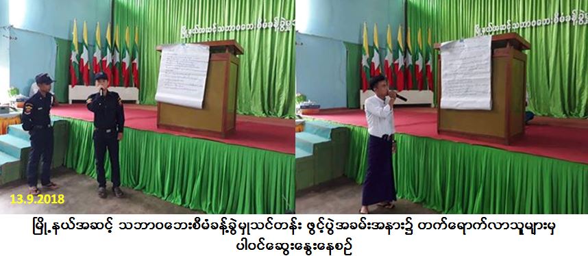 အဖွဲ့လိုက်ဆွေးနွေးခြင်းများဆောင်ရွက်ခဲ့ပါသည်။ အဆိုပါဖွင့်ပွဲအခမ်းအနားသို့ ပြည်နယ်လွှတ်တော် ကိုယ်စားလှယ်များ၊ မြို့မိမြို့ဖများ၊ ဌာနဆိုင်ရာများ၊ ရပ်/ကျေးအုပ်ချုပ်ရေးမှူးများနှင့် သင်တန်းသား/သူ (၅၀) ဦး တက်ရောက်ခဲ့ပြီး သင်တန်းကာလမှာ (၂) ရက်ဖြစ်ကြောင်းသတင်းရရှိပါသည်။