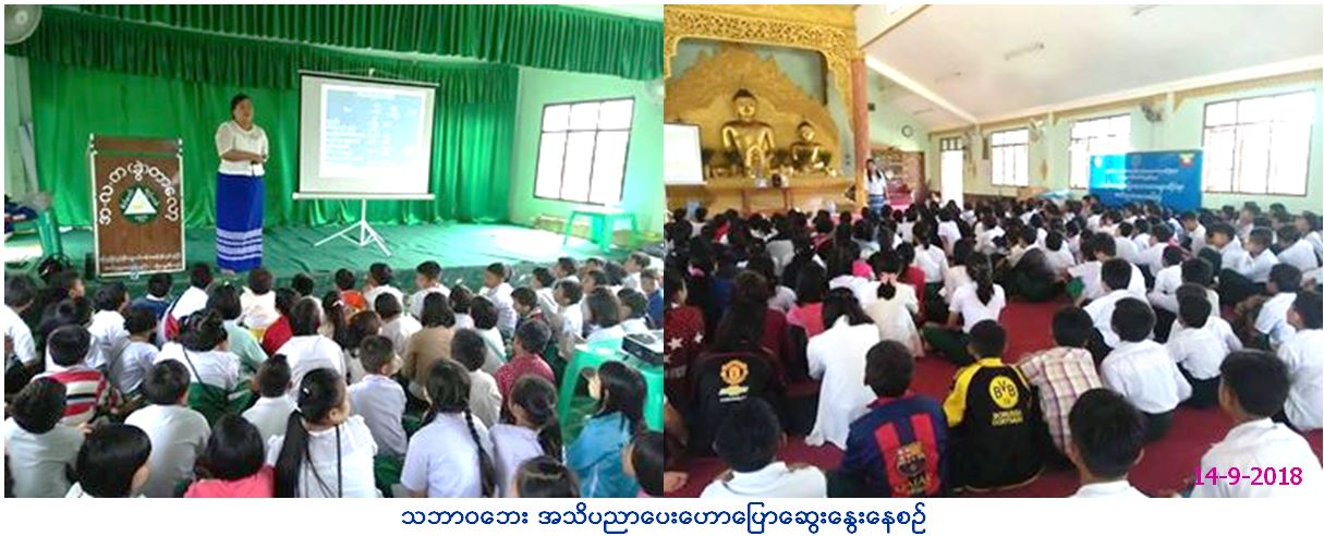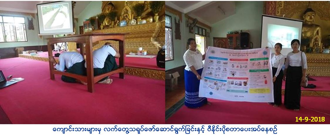 လူမှုဝန်ထမ်း၊ ကယ်ဆယ်ရေးနှင့် ပြန်လည်နေရာချထားရေးဝန်ကြီးဌာန၊ ဘေးအန္တရာယ်ဆိုင်ရာစီမံခန့်ခွဲမှုဦးစီးဌာန၊ ကျိုင်းတုံခရိုင်ဦးစီးမှူးရုံးမှ တာဝန်ရှိသူများသည် (၁၃.၉.၂၀၁၈)ရက်နေ့ နံနက် (၁၃း၀၀)နာရီမှ (၁၅း၀၀)နာရီထိ တာချီလိတ်မြို့နယ်၊ အ-လ-က ရန်အောင်မြေကျောင်း တွင် ကျောင်းသား၊ ကျောင်းသူ စုစုပေါင်း (၃၀၀)ဦးအား သဘာဝဘေး အသိပညာပေးဟောပြောဆွေးနွေးခဲ့ပြီး ဗီနိုင်းပိုစတာများပေးအပ်ခဲ့ ကြောင်း သတင်းရရှိပါသည်။