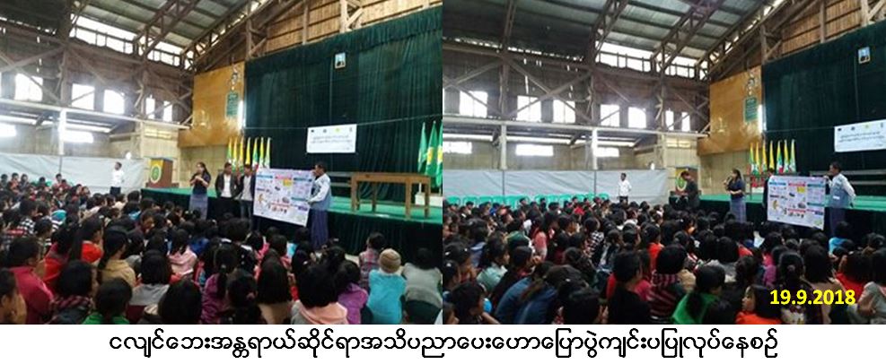 လူမှုဝန်ထမ်း၊ ကယ်ဆယ်ရေးနှင့် ပြန်လည်နေရာချထားရေးဝန်ကြီးဌာန၊ ဘေးအန္တရာ ယ်ဆိုင်ရာစီမံခန့်ခွဲမှုဦးစီးဌာန၊ ချင်းပြည်နယ်ဦးစီးမှူးရုံးမှ တာဝန်ရှိသူများ၊ ပညာရေးဝန်ကြီးဌာနနှင့် (UNDP) တို့ပူးပေါင်း၍ ချင်းပြည်နယ်၊ ဟားခါးမြို့၊ အ-ထ-က (၂) စာသင်ကျောင်းရှိ ဗိုလ်ကြွမ်ဘိခ့်ခန်းမ၌ (၁၉-၉-၂၀၁၈) ရက်နေ့တွင် ငလျင်ဘေးအန္တရာယ်ဆိုင်ရာ အသိပညာပေးဟောပြော ပွဲကျင်းပပြုလုပ်ခဲ့ရာ ကျောင်းသား/သူ (၅၀၀) ကျော်တက်ရောက်ခဲ့ကြပြီး တက်ရောက်လာသူများအား ငလျင်အသိပညာပေးပိုစတာ၊ ငလျင်အန္တရာယ်ပြမြေပုံ၊ ဇာတ်တိုက်လေ့ကျင့်မှုစာအုပ်များ၊ ငလျင်အန္တရာယ်အသိပညာပေး လက်ကမ်းစာစောင်များနှင့် အချက်ပေး Whistle (၅) ခု တို့အား ပေးအပ်ခဲ့ပါကြောင်း သတင်းရရှိပါသည်။