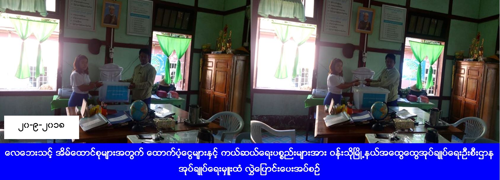 လူမှုဝန်ထမ်း၊ ကယ်ဆယ်ရေးနှင့် ပြန်လည်နေရာချထားရေးဝန်ကြီးဌာန၊ ဘေးအန္တရာယ်ဆိုင်ရာစီမံခန့်ခွဲမှုဦးစီးဌာန၊ ကောလင်းမြို့နယ်ဦးစီးမှူးရုံးမှ တာဝန်ရှိသူများသည် စစ်ကိုင်းတိုင်းဒေသကြီး၊ ကသာခရိုင်၊ ဝန်းသိုမြို့နယ်၊ တောင်ကုန်းကျေးရွာအုပ်စု၊ ကျောက်ပါးစပ်ဒေသ၌ (၁၈-၉-၂၀၁၈) ရက်နေ့၊ (၁၃း၃၀) နာရီအချိန်တွင် ဖြစ်ပွားခဲ့သော လေပြင်းဘေးကြောင့် အမိုးလန်ခဲ့သည့် နေအိမ် (၃) လုံးအတွက် ကယ်ဆယ်ရေးပစ္စည်း (၁၀) မျိုးပါ (၃) အိမ်ထောင်စာနှင့် အိမ်ဆောက်ပစ္စည်းဖိုးထောက်ပံ့ငွေ (၉၀၀၀၀) ကျပ်အား (၂၀-၉-၂၀၁၈)ရက်နေ့၊ (၁၆း၀၀) နာရီအချိန်တွင် ဝန်းသိုမြို့နယ်အထွေထွေအုပ်ချုပ်ရေးဦးစီးဌာနရုံး၌ အုပ်ချုပ်ရေးမှူးထံသို့ လွှဲပြောင်းထောက်ပံ့ ပေးအပ်ခဲ့ကြောင်း သိရှိရပါသည်။