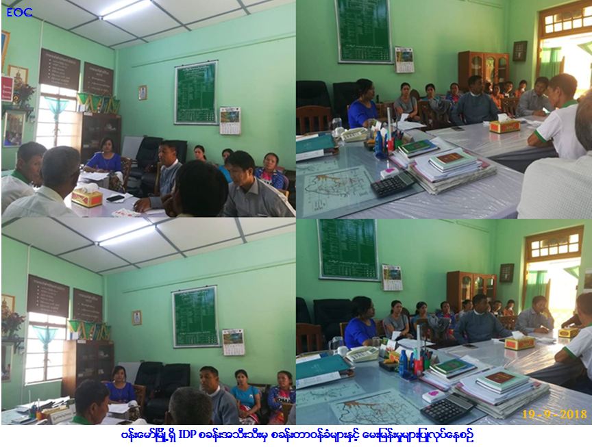 လူမှုဝန်ထမ်း၊ ကယ်ဆယ်ရေးနှင့် ပြန်လည်နေရာချထားရေးဝန်ကြီးဌာန၊ ဘေးအန္တရာယ်ဆိုင်ရာစီမံခန့်ခွဲမှုဦးစီးဌာန၊ ကချင်ပြည်နယ်ဦးစီးမှူးရုံးမှ ပြည်နယ်ဦးစီးမှူးသည်(၁၈-၉-၂၀၁၈) နှင့် (၁၉-၉-၂၀၁၈) ရက်နေ့တို့တွင် ဗန်းမော်ခရိုင်အတွင်း လူမှုရေးဝန်ကြီးခရီးစဉ်တွင်လိုက်ပါ၍ မိုးမောက်မြို့နယ်ရှိ ကက်သလစ်၊ နှစ်ခြင်း၊ မန္တလေးကျောင်းစခန်း (၃) ခုရှိ IDP စခန်းတာဝန်ခံများပြည်သူများနှင့်လည်းကောင်း၊ မံစီမြို့နယ် နှစ်ခြင်းကျောင်း၊ မိုင်းခေါင်(ကက်သလစ်)၊ မိုင်းခေါင် (နှစ်ခြင်း) စခန်းတာဝန်ခံများ ပြည်သူများနှင့်လည်းကောင်း ၊ဗန်းမော်မြို့နယ်ရှိ လီဆူးနှစ်ခြင်းဘော်ဒါ၊ နှစ်၂၀၀၀ (အာရ်စီ)၊ ရောဘတ်ကျောင်း၊ ထွယ်ဆန်ကျောင်းနှစ်ခြင်း၊ ရိုးကြီးရွာမကျောင်း၊ နန့်လှိုင်ဖန်းခါးကုန်းစခန်းတာဝန်ခံများပြည်သူများနှင့်လည်းကောင်း တွေ့ဆုံခဲ့ပြီး ကချင်ပြည်နယ်တွင်ငြိမ်းချမ်းရေးကိုဖော်ဆောင်၍ လူမှုစီးပွားဖွံ့ဖြိုးတိုး တက်အောင် ဆောင်ရွက်လျက်ရှိပါကြောင်း၊ အပြုသဘောဆောင်၍ IDPs စခန်းများပိတ်သိမ်းရာတွင် ဥပဒေအရ လွတ်လပ်စွာသွားလာခြင်း၊ ပညာရေး၊ ကျန်းမာရေး၊ အလုပ်အကိုင်အခွင့်အလမ်း လက်လှမ်းမီရေး၊ မိမိငွေဖြင့် မြေကွက်ဝယ်ယူထားပြီးစခန်းမှ ပြောင်းရွေ့လို့သည့် ပြည်သူများအား မိမိတို့ဝန်ကြီးဌာန ပြည်နယ်အစိုးရမှ ကူညီဆောင်ရွက်ပေးမှုများ၊ ပြန်လည်ထူထောင်ရေးတွင် ပံ့ပိုးမှုများအကြောင်းရှင်းလင်း၍ လိုအပ်ချက်များ၊ မေးမြန်းချက်များညှိနှိုင်းဆောင်ရွက်ပေးခဲ့ပြီး၊ ဒိန်ဂါးယန် (အစိုးရထိန်းချုပ်မှုမရှိသောနေရာ) မှ ဒေါ့ဖုန်းယန်ကျေးရွာသို့ ပြန်ရောက်လာသူ အိမ်ထောင်စု (၄)၊ လူဦးရေ (၂၄) ဦးအားတွေ့ဆုံ၍ ပြန်ရောက်လာသူများအခြေအနေနှင့် ဆက်လက်၍ ပြန်လည်ဝင်လာသူအခြေအနေများအား မေးမြန်းစုံစမ်းခဲ့ပါကြောင်း သတင်းရရှိပါသည်။