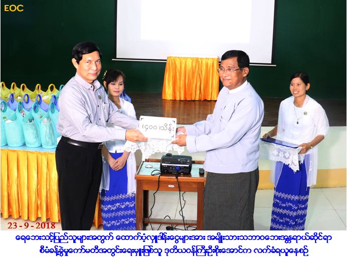 ထို့နောက် ရေဘေးသင့်ပြည်သူများအတွက် စက်မှုဝန်ကြီးဌာနနှင့် အကျိုးတူပူးပေါင်းဆောင်ရွက်လျက်ရှိ သည့် လုပ်ငန်းရှင်များမှ ထောက်ပံ့လှူဒါန်းငွေကျပ်သိန်း (၄၀၀) ကို ပြည်ထောင်စုဝန်ကြီး ဦးခင်မောင်ချိုက အမျိုးသားသဘာဝဘေးအန္တရာယ်ဆိုင်ရာစီမံခန့်ခွဲမှုကော်မတီသို့ ပေးအပ်လှူဒါန်းရာ ကော်မတီအတွင်းရေးမှူးဖြစ်သူ လူမှုဝန်ထမ်း၊ ကယ်ဆယ်ရေးနှင့် ပြန်လည်နေရာချထားရေးဝန်ကြီးဌာန၊ ဒုတိယဝန်ကြီး ဦးစိုးအောင်က လက်ခံရယူပြီး ဂုဏ်ပြုမှတ်တမ်းလွှာပြန်လည်ပေးအပ်ကာ ကျေးဇူးတင်စကားပြောကြားခဲ့ကြောင်း သတင်းရရှိပါသည်။