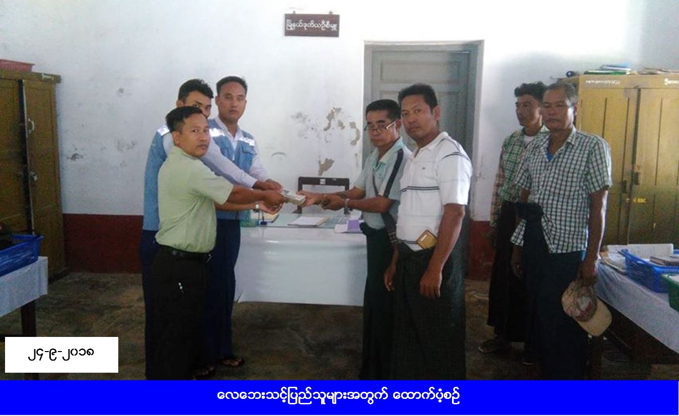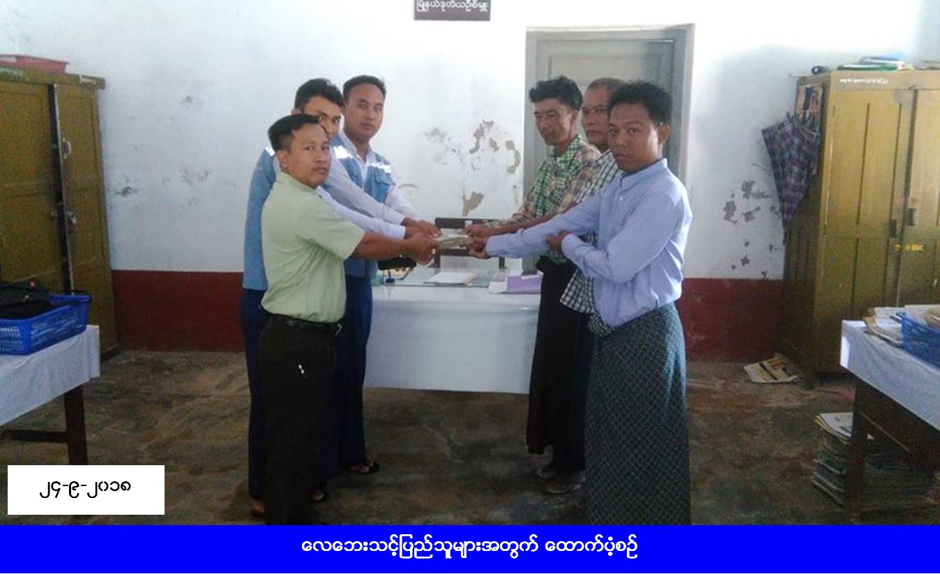 လူမှုဝန်ထမ်း၊ ကယ်ဆယ်ရေးနှင့် ပြန်လည်နေရာချထားရေးဝန်ကြီးဌာန၊ ဘေးအန္တရာယ်ဆိုင်ရာစီမံခန့်ခွဲမှုဦးစီးဌာန၊ ပြည်ခရိုင်ဦးစီးမှူးရုံးမှ တာဝန်ရှိသူများသည် ပဲခူးတိုင်းဒေသကြီး၊ သာယာဝတီခရိုင်၊ နတ်တလင်းမြို့နယ်၊ ပဲမခမ်းကျေးရွာအုပ်စု၌ (၁၅-၉-၂၀၁၈) ရက်နေ့တွင် ဖြစ်ပွားခဲ့သော လေဘေးကြောင့် အမိုးလန်ခဲ့သည့် နေအိမ် (၁) လုံးအတွက် တန်ဖိုးသင့်နှုန်းထားဖြင့် အိမ်ဆောက်ပစ္စည်းဖိုးထောက်ပံ့ငွေ (၇၈၀၀၀)ကျပ်ကိုလည်းကောင်း၊