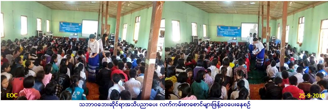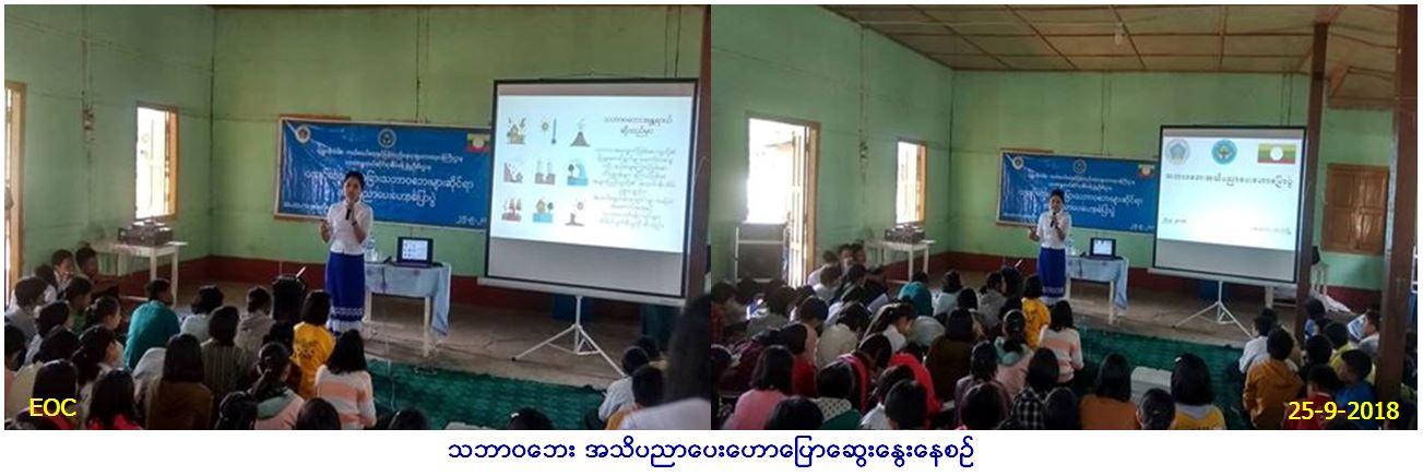 လူမှုဝန်ထမ်း၊ ကယ်ဆယ်ရေးနှင့်ပြန်လည်နေရာချ ထားရေးဝန်ကြီးဌာန၊ ဘေးန္တရာယ်ဆိုင်ရာစီမံခန့်ခွဲမှု ဦးစီးဌာန၊ ရှမ်းပြည်နယ်ဦးစီးမှူးရုံးမှ တာဝန်ရှိသူများ သည် (၂၅.၉.၂၀၁၈)ရက်နေ့၊ နံနက်ပိုင်းတွင် ဟဲဟိုးမြို့၊ အ-ထ-က(၄)ကျောင်း၌ ကျောင်းသား/ကျောင်းသူ(၆၀၀)ဦး အား သဘာဝဘေး အသိပညာပေးဟောပြောပွဲပြုလုပ်ခဲ့ရာ သဘာဝဘေးဆိုင်ရာအသိပညာပေး ဗီဒီယိုပြသခြင်း၊ လက်ကမ်းစာစောင်များပေးဝေခြင်း နှင့် မိုးကြိုးဘေးဆိုင်ရာ နံရံကပ်ပိုစတာများပေးအပ်ခြင်း များဆောင်ရွက်ခဲ့ကြောင်း သတင်းရရှိပါသည်။