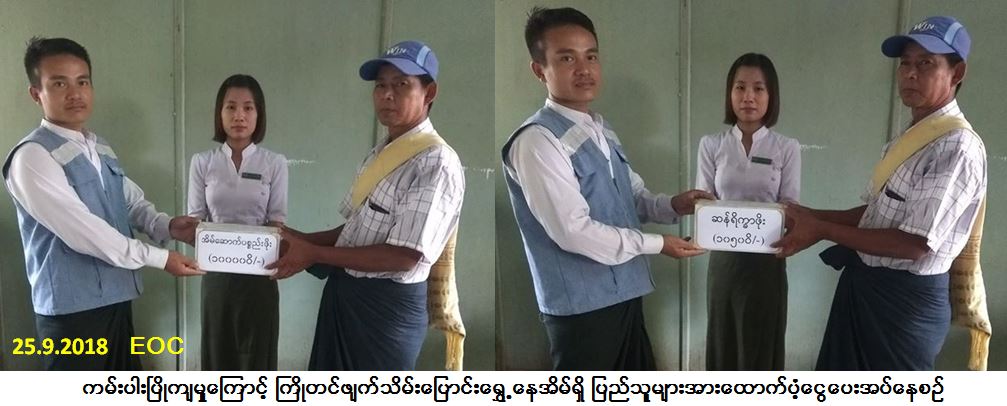 လူမှုဝန်ထမ်း၊ ကယ်ဆယ်ရေးနှင့် ပြန်လည်နေရာချထားရေးဝန်ကြီးဌာန၊ ဘေးအန္တရာယ်ဆိုင်ရာစီမံ ခန့်ခွဲမှုဦးစီးဌာန၊ ရေစကြိုမြို့နယ်ဦးစီးမှူးရုံးမှတာဝန်ရှိသူများသည် ရေစကြိုမြို့နယ်အထွေထွေ အုပ်ချုပ်ရေးရုံး မှ တာဝန်ရှိသူများနှင့် အတူ ပခုက္ကူခရိုင်၊ ရေစကြိုမြို့နယ်၊ ကွေ့ထောင့်ကျေးရွာအုပ်စု၊ ကွေ့ထောင့်ကျေး ရွာ၌ (၂၀-၉-၂၀၁၈) ရက်နေ့၊ (၁၁း၁၅) နာရီအချိန်တွင် ဖြစ်ပွားခဲ့သော ဧရာဝတီမြစ်ရေတိုက်စား၍ ကမ်းပါး ပြိုကျမှုကြောင့် ကြိုတင်ဖျက်သိမ်းပြောင်းရွှေ့နေအိမ် (၁) လုံး၊ အိမ်ထောင်စု (၁) စုမှ လူဦးရေ (၅) ဦး တို့အတွက် ကယ်ဆယ်ရေးပစ္စည်း (၉) မျိုး၊ ဆန်ရိက္ခာဖိုး (၇) ရက်စာ (၁၀,၅၀၀/-) ကျပ်၊ အိမ်ဆောက်ပစ္စည်းဖိုး ထောက်ပံ့ငွေ (၁၀၀,၀၀၀/- ) ကျပ်၊ စုစုပေါင်း ထောက်ပံ့ငွေ (၁၁၀,၅၀၀/-) ကျပ်အား ရေစကြိုမြို့နယ်အထွေထွေအုပ်ချုပ်ရေးဦးစီးဌာနရုံး၌ (၂၅-၉-၂၀၁၈) ရက်နေ့တွင် ဘေးသင့်ပြည်သူများထံသို့ သွားရောက်ထောက်ပံ့ပေးအပ်ခဲ့ကြောင်း သတင်းရရှိပါသည်။