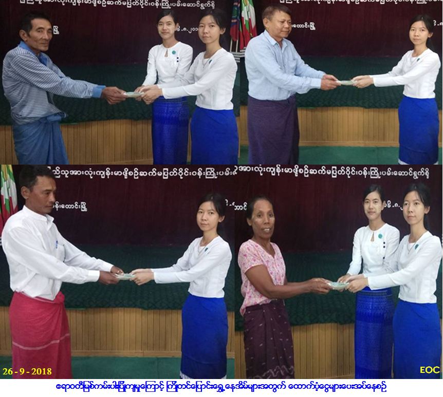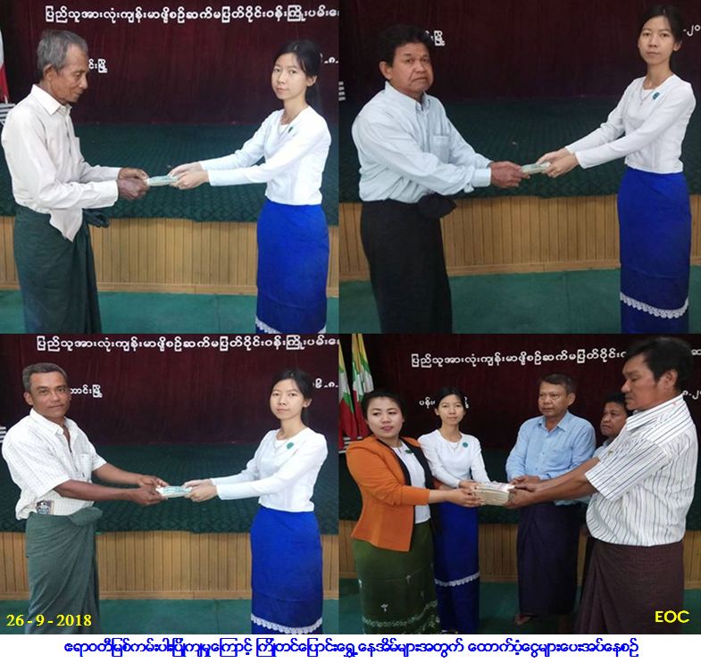 လူမှုဝန်ထမ်း၊ ကယ်ဆယ်ရေးနှင့် ပြန်လည်နေရာချထားရေးဝန်ကြီးဌာန၊ ဘေးအန္တရာယ်ဆိုင်ရာစီမံခန့်ခွဲမှုဦးစီးဌာန၊ ပန်းတောင်းမြို့နယ်ဦးစီးမှူးရုံးမှ တာဝန်ရှိသူများသည် ပန်းတောင်းမြို့နယ်၊ ကျွန်းမီးကျေးရွာအုပ်စု၊ ကျွန်းမီးကျေးရွာ၌ (၁၄-၉-၂၀၁၈) ရက်နေ့တွင် ဧရာဝတီမြစ်ကမ်းပါးပြိုကျမှုကြောင့် ကြိုတင်ရွှေ့ပြောင်းနေအိမ် (၁၉) လုံးနှင့် ပန်းတောင်း မြို့နယ်၊ ကျွန်းမီးအုပ်စု၊ ရွှေတောင်စုကျေးရွာ၌ (၁၉-၉-၂၀၁၈) ရက်နေ့တွင် ဧရာဝတီမြစ်ကမ်းပါးပြိုကျမှုကြောင့် ကြိုတင်ရွှေ့ပြောင်းနေအိမ် (၃၃) လုံး၊ စုစုပေါင်း (၅၂)လုံးတို့အတွက် အိမ်ဆောက်ပစ္စည်းဖိုးငွေ (၅,၂၀၀,၀၀၀/-) ကျပ် တို့အား (၂၆-၉-၂၀၁၈) ရက်နေ့၊ (၁၀း၄၅) နာရီအချိန်တွင် ပန်းတောင်းမြို့ အထွေထွေအုပ်ချုပ်ရေးဦးစီးဌာနတွင် ကျေးရွာအုပ်ချုပ်ရေးမှူးနှင့်အတူ ဘေးသင့်ပြည်သူများလက်ဝယ်သို့ ထောက်ပံ့ပေးအပ်ခဲ့ကြောင်း သတင်းရရှိပါသည်။