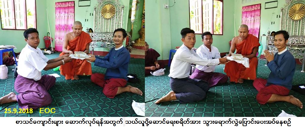 လူမှုဝန်ထမ်း၊ ကယ်ဆယ်ရေးနှင့် ပြန်လည်နေရာချထားရေးဝန်ကြီးဌာန၊ ဘေးအန္တရာယ်ဆိုင်ရာစီမံ ခန့်ခွဲမှုဦးစီးဌာန၊ ရခိုင်ပြည်နယ်ဦးစီးမှူးရုံးမှ တာဝန်ရှိသူများသည် ရခိုင်ပြည်နယ်အတွင်းရှိ ကျော က်တော်မြို့နယ်၊ မြောက်ဦးမြို့နယ်နှင့် ရသေ့တောင်မြို့နယ်များ၌ စာသင်ကျောင်းများအတွက် Assembled Board House (၁၈) ပေ၊ (၅) ခန်းတွဲ၊ (၄) လုံးဆောက်လုပ်ရန် သယ်ယူပို့ဆောင်ရေးစရိတ်အဖြစ် (ငွေကျပ်သိန်းတစ်ရာ/-) အား (၂၅-၉-၂၀၁၈) ရက်နေ့တွင် စစ်တွေမြို့၊ မဏိရတနာကျောင်းတိုက်၊ စာချဆရာတော် ဦးဉာဏထံသို့ သွားရောက်လွှဲပြောင်းပေးအပ်ခဲ့ကြောင်းသတင်းရရှိပါသည်။
