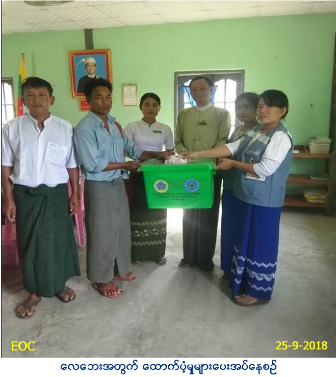 လူမှုဝန်ထမ်း၊ ကယ်ဆယ်ရေးနှင့်ပြန်လည်နေရာချ ထားရေးဝန်ကြီးဌာန၊ ဘေးအန္တရာယ်ဆိုင်ရာစီမံ ခန့်ခွဲမှုဦးစီးဌာန၊ ဧရာဝတီတိုင်းဒေသကြီး၊ ပုသိမ်ခရိုင်၊ ရေကြည်မြို့နယ်၊ ငါးသိုင်းချောင်းမြို့၊ ကွင်းလျားကျေးရွာအုပ်စု၊ အုန်းပင်စုကျေးရွာတွင် (၂၀-၉-၂၀၁၈)ရက်နေ့၌ ဖြစ်ပွားခဲ့သော လေဘေးကြောင့် ပြိုကျပျက်စီးနေအိမ် (၁)လုံး၊ အိမ်ထောင်စု (၁)စုမှ လူဦးရေ (၄)ဦးအတွက် ကယ်ဆယ်ရေးပစ္စည်း (၁၆)မျိုး (၁)အိမ်ထောင် စာ (၃၇၃၅၃/-)ကျပ်၊ ဆန်ရိက္ခာ(၇)ရက်စာ ရန်ပုံငွေ (၈၄၀၀/-)ကျပ်၊ အိမ်ဆောက်ပစ္စည်းဖိုး (၁၀၀၀၀၀/-) ကျပ်၊ စုစုပေါင်းရန်ပုံငွေ (၁၀၈၄၀၀/-)ကျပ်တို့အား (၂၅-၉-၂၀၁၈)ရက်နေ့ (၁၀း၃၀)နာရီအချိန်တွင် ငါးသိုင်းချောင်းမြို့အထွေထွေအုပ်ချုပ်ရေးဦးစီးဌာနမှ တာဝန်ရှိသူများနှင့်အတူ ဘေးသင့်ပြည်သူများ လက်ဝယ်အရောက် ထောက်ပံ့ပေးအပ်ခဲ့ကြောင်း သတင်းရရှိပါသည်။