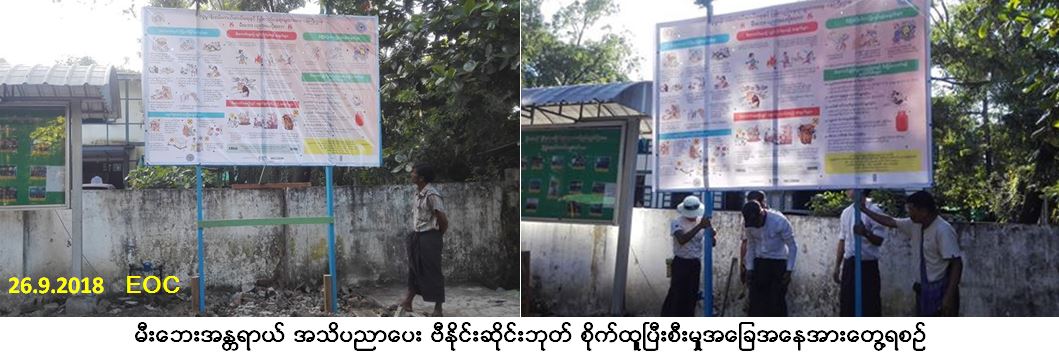 လူမှုဝန်ထမ်း၊ ကယ်ဆယ်ရေးနှင့် ပြန်လည်နေရာချထားရေးဝန်ကြီးဌာန၊ ဘေးအန္တရာယ်ဆိုင်ရာစီမံ ခန့်ခွဲ မှုဦးစီးဌာန၊မြဝတီခရိုင်ဦးစီးမှူးရုံးမှ တာဝန်ရှိသူများသည် ကရင်ပြည်နယ်၊ မြဝတီခရိုင်၊ မြဝတီမြို့၊ ဦးအောင်ဇေယျလမ်း၊ မြဝတီခရိုင် ပြန်/ဆက်ဦးစီးဌာနရုံးအနီး၌ (၂၆-၉-၂၀၁၈) ရက်နေ့၊ မွန်းလွဲ (၁၅း၀၀) နာရီအချိန်တွင် ကျောင်းသား လူငယ်များနှင့် အများပြည်သူများအား ဘေးအန္တရာယ်ဆိုင်ရာ ဆောင်ရန်/ရှောင်ရန် အသိပညာများ တိုးပွားစေရန် အတွက် မီးဘေးအန္တရာယ် အသိပညာပေးဆိုင်းဘုတ်အား စိုက်ထူခဲ့ကြောင်းသတင်းရရှိသည်။