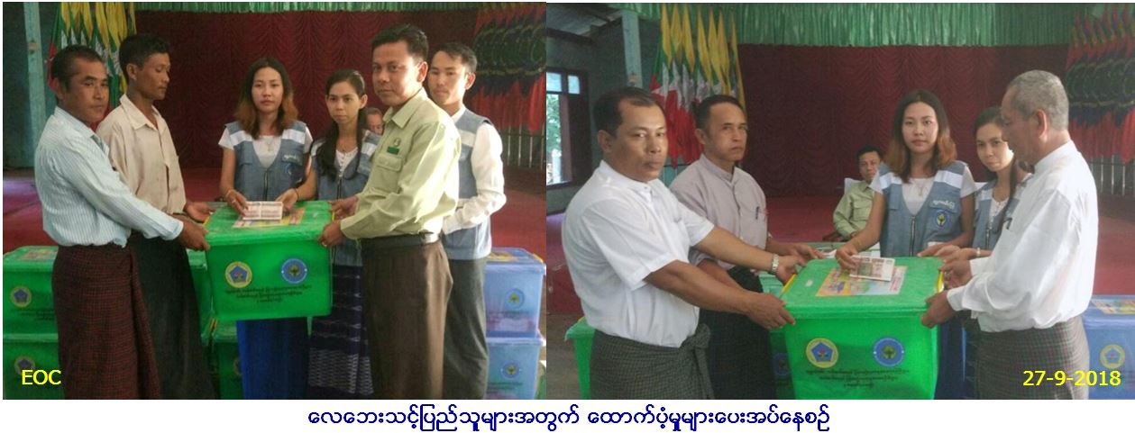 လူမှုဝန်ထမ်း၊ ကယ်ဆယ်ရေးနှင့်ပြန်လည်နေရာချ ထားရေးဝန်ကြီးဌာန၊ ဘေးအန္တရာယ်ဆိုင်ရာစီမံခန့့်ခွဲ မှုဦးစီးဌာန၊ ဧရာဝတီတိုင်းဒေသကြီး ဦးစီးမှူးရုံးမှ တာဝန်ရှိသူများသည် သာပေါင်းမြို့နယ် ပြည်သူ့ လွှတ်တော်ကိုယ်စားလှယ်ဦးသိန်းထွန်း၊ သာပေါင်းမြို့နယ်အုပ်ချုပ်ရေးမှူးတို့နှင့်အတူ ဧရာဝတီတိုင်းဒေသကြီး၊ ပုသိမ်ခရိုင်၊ သာပေါင်းမြို့ နယ်၊ ဘုရားကုန်းကျေးရွာ၊ ဘုရားနီကျေးရွာ၊ ခေနန်ကျေးရွာ၊ ထန်းဇင်လှကြို့ကုန်း ကျေးရွာနှင့် အုတ်ရှစ်ကျေးရွာတို့တွင် (၂၀.၉.၂၀၁၈)ရက်နေ့၌ ဖြစ်ပွားခဲ့သော လေဘေးကြောင့် ပြိုကျနေအိမ် (၇)လုံး၊ အမိုးလန်နေအိမ် (၄)လုံးတို့အတွက် ကယ်ဆယ်ရေးပစ္စည်း (၁၀)မျိုးပါ (၄)ပုံး (၇၄၀၄၀/-)ကျပ်၊ ကယ်ဆယ်ရေးပစ္စည်း (၁၆)မျိုးပါ (၇)ပုံး (၂၆၁၄၇၁)ကျပ်၊ အိမ်ဆောက်ပစ္စည်းဖိုး (၁၀၀၀၀၀၀/-)ကျပ်၊ လူဦးရေ (၄၆)ဦးအတွက် ဆန်ရိက္ခာ (၇)ရက်စာ (၉၆၆၀၀/-)ကျပ်၊ စုစုပေါင်းတန်ဖိုးငွေ (၁၄၃၂၁၁၁/-)ကျပ်တို့အား (၂၈.၉.၂၀၁၈)ရက်နေ့ (၁ရး၀၀)နာရီအချိန်တွင် လေဘေးသင့်ပြည်သူများ လက်ဝယ် အရောက်ထောက်ပံ့ပေးအပ်ခဲ့ကြောင်း သတင်းရရှိပါသည်။