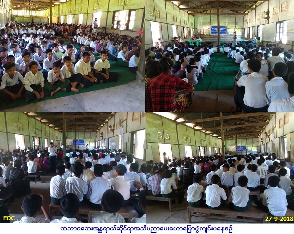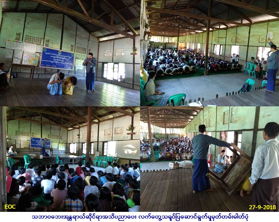 လူမှုဝန်ထမ်း၊ ကယ်ဆယ်ရေးနှင့်ပြန်လည်နေရာချ ထားရေးဝန်ကြီးဌာန၊ ဘေးအန္တရာယ်ဆိုင်ရာစီမံခန့်ခွဲ မှုဦးစီးဌာန၊ ပြည်ခရိုင်ဦးစီးမှူးရုံးမှ တာဝန်ရှိသူများ သည် ပဲခူးတိုင်းဒေသကြီး၊ ပြည်ခရိုင်၊ ပြည်မြို့၊ ဝက်ထီးကန်တိုက်နယ်၊ လွှစင်ကျေးရွာအုပ်စု၊ လယ်ဘဲ့ကျေးရွာ၊ အခြေခံပညာ အထက်တန်းကျောင်း၌ (၂၇.၉.၂၀၁၈)ရက်နေ့၊ (၁၄း၀၀)နာရီအချိန်မှ (၁၅း၁၅)နာရီချိန်အထိ ဆရာ/ဆရာမများ၊ ကျောင်းသား/သူများနှင့်ကျေး ရွာသူ/သားများ စုစုပေါင်းအင်အား(၂၀၀)ဦးကျော် တို့်ဖြင့် ဆောင်ရွက်ခဲ့ပါသည်။ ယင်းပွဲ၌ ပြည်မြို့နယ်သဘာဝဘေးလျော့ပါးရေး(ဆင့်ပွား) သင်တန်းဆင်း-စေတနာ့ဝန်ထမ်းလူငယ်(၃)ဦးတို့ပူးပေါင်းပါဝင်ပြီး အသိပညာပေးဟောပြောခြင်း၊ လက်တွေ့သရုပ်ပြခြင်းနှင့် ဂိမ်းကစားခြင်းများဖြင့် ဆောင်ရန်/ရှောင်ရန်အချက်များကို သိသာထင်ရှားအောင်ဆောင်ရွက်ခဲ့ပြီး၊ အသိပညာပေးလက်ကမ်းစာစောင်များနှင့် ခေါက်ဆွဲခြောက်ထုပ်များ ပေးဝေခဲ့ကြောင်း သတင်းရရှိပါသည်။
