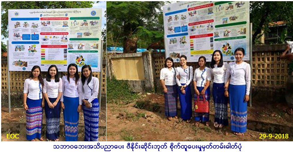 လူမှုဝန်ထမ်း၊ ကယ်ဆယ်ရေးနှင့်ပြန်လည်နေရာချ ထားရေးဝန်ကြီးဌာန၊ ဘေးအန္တရာယ်ဆိုင်ရာစီမံ ခန့်ခွဲမှုဦးစီးဌာန၊ မွန်ပြည်နယ်ဦးစီးမှူးရုံးမှ တာဝန်ရှိသူများသည် (၂၉-၉-၂၀၁၈)ရက်နေ့တွင် သဘာဝဘေးအမျိုးမျိုးနှင့်ပတ်သက်ပြီး ဆောင်ရန်/ရှောင်ရန်အချက်များအား ပြည်သူလူထု များသိရှိစေရန်အတွက် မော်လမြိုင်မြို့၊ မရမ်းကုန်းရပ်ကွက် အ.ထ.က-၆ မီးပွိုင့်အနီးတွင် သဘာဝဘေးအသိပညာပေးဗီနိုင်းဆိုင်းဘုတ်အား သွားရောက်စိုက်ထူပေးခဲ့ကြောင်း သတင်းရရှိပါသည်။