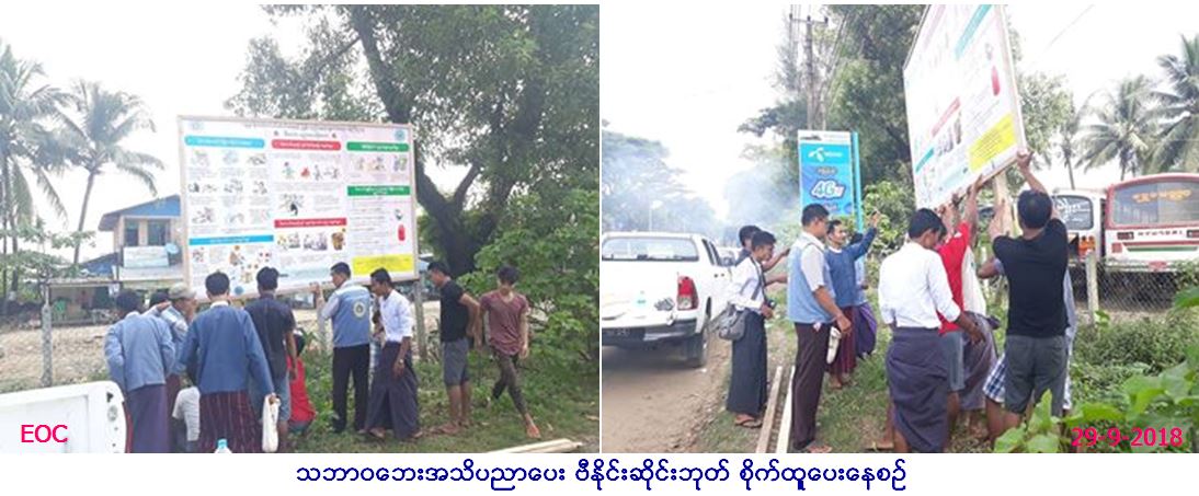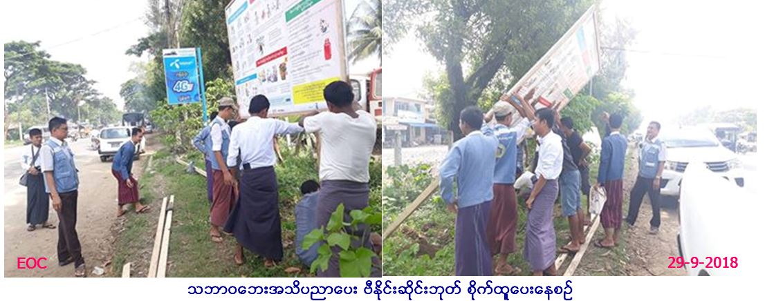လူမှုဝန်ထမ်း၊ ကယ်ဆယ်ရေးနှင့်ပြန်လည်နေရာချ ထားရေးဝန်ကြီးဌာန၊ ဘေးအန္တရာယ်ဆိုင်ရာစီမံ ခန့်ခွဲမှုဦးစီးဌာန၊ ရခိုင်ပြည်နယ်ဦးစီးမှူးရုံးမှ တာဝန်ရှိသူများသည် (၂၉-၉-၂၀၁၈)ရက် (၀၈း၃၀)နာရီမှ (၁၀း၅၀)နာရီအထိ စစ်တွေမြို့လူစည်ကားရာ အဝေးပြေးကားဝင်း၌ မီးဘေး အသိပညာပေးဆိုင်းဘုတ်အား လည်းကောင်း၊ စစ်တွေမြို့၊ လမ်းဆုံလမ်းခွ လူစည်ကားရာ လောကနန္ဒာဘုရားရှေ့တွင် မုန်တိုင်းဘေး အသိပညာပေးဆိုင်းဘုတ် အားလည်းကောင်း စိုက်ထူခဲ့ကြောင်း သတင်းရရှိပါသည်။