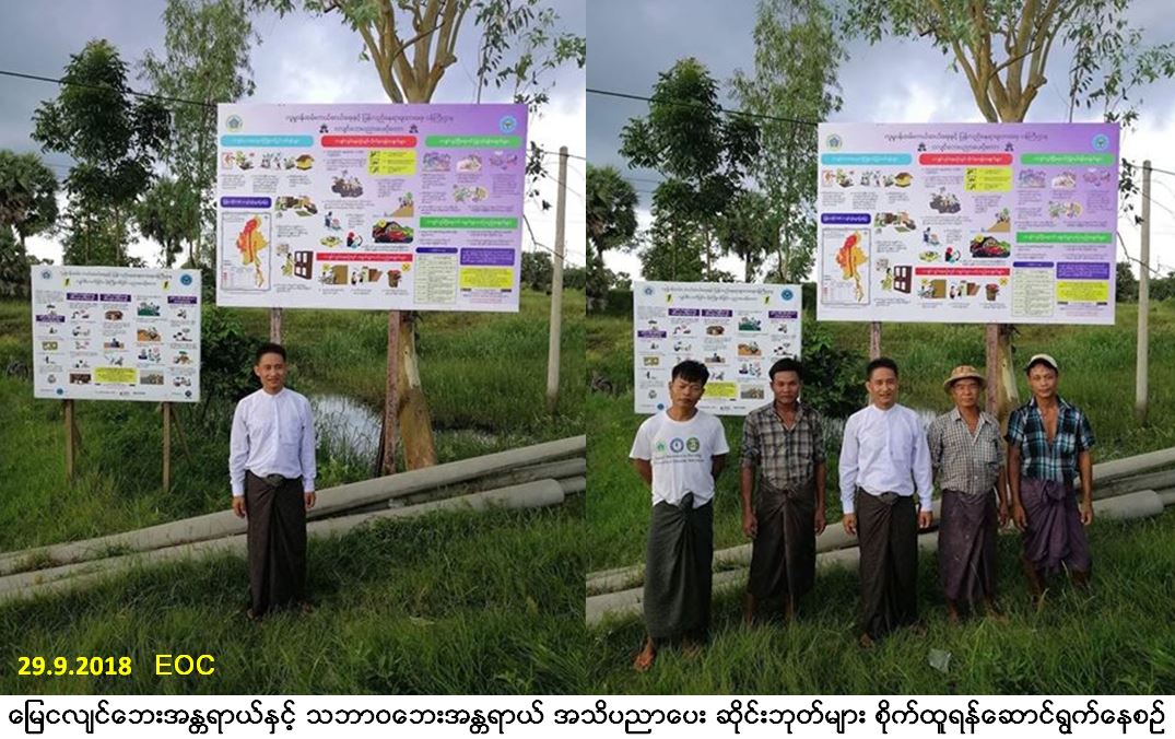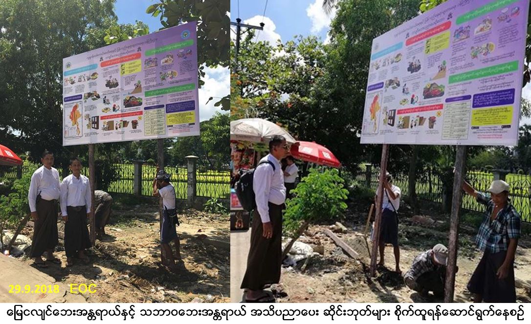 လူမှုဝန်ထမ်း၊ ကယ်ဆယ်ရေးနှင့် ပြန်လည်နေရာချထားရေးဝန်ကြီးဌာန၊ ဘေးအန္တရာယ်ဆိုင်ရာစီမံ ခန့်ခွဲမှုဦးစီးဌာန၊ ရန်ကုန်တိုင်းဒေသကြီးဦးစီးမှူးရုံးမှ တာဝန်ရှိသူများသည် မြေငလျင်ဘေး အန္တရာ ယ်နှင့် သဘာဝဘေးအန္တရာယ် အသိပညာပေး ဆိုင်းဘုတ်များ စိုက်ထူနိုင်ရန်အတွက် ရန်ကုန်မြို့တော်စည်ပင်သာယာရေးကော်မတီမှ ခွင့်ပြုချက် ရယူဆောင်ရွက်ခဲ့ပြီး (၂၉-၉-၂၀၁၈) ရက်နေ့တွင် လှိုင်သာယာမြို့နယ် တွံတေးလမ်းဆုံနေရာ၊ ရွှေပြည်သာ မြို့ဝင်နေရာ၊ မင်္ဂလာဒုံမြို့နယ်ရှိ ဝါယာလက်ဈေးရှေ့နေရာ၊ ဒဂုံမြို့သစ် (တောင်ပိုင်း) ရှိ နတ်စင်လမ်းဆုံနေရာနှင့် ဒဂုံဆိပ်ကမ်းမြို့သစ် သိမ်ကျောင်းလမ်းဆုံနေရာတို၌လည်းကောင်း၊ (၃၀-၉-၂၀၁၈) ရက်နေ့၊ နေ့လည်ပိုင်းတွင် အင်းစိန်မြို့နယ်၊ စော်ဘွားကြီးကုန်းရှိ ပန်းခြံရှေ့နေရာ၊ သုံးခွမြို့ဝင်နေရာတို့၌လည်းကောင်း မြေငလျင် ဘေးအန္တရာယ်နှင့် သဘာဝဘေးအန္တရာယ် အသိပညာပေး ဆိုင်းဘုတ်များ စိုက်ထူခဲ့ကြောင်းသတင်းရရှိပါသည်။