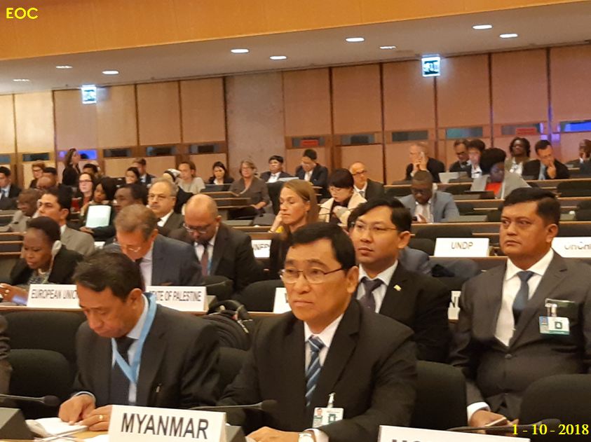 ၁။ ဆွစ်ဇာလန်နိုင်ငံ၊ ဂျီနီဗာမြို့တွင် (၁-၁၀-၂၀၁၈) ရက်မှ (၅-၁၀-၂၀၁၈) ရက်အထိ ကျင်းပနေ သည့် (၆၉) ကြိမ်မြောက် Executive Committee of the High Commissioner’s Programme (Ex-COM) သို့တက်ရောက်နေသည့် လူမှုဝန်ထမ်း၊ ကယ်ဆယ်ရေးနှင့် ပြန်လည်နေရာချထားရေး ဝန်ကြီးဌာန၊ ပြည်ထောင်စုဝန်ကြီး၊ UEHRD ဒုတိယဥက္ကဌဒေါက်တာဝင်းမြတ်အေးဦးဆောင်သည့် မြန်မာကိုယ်စားလှယ်အဖွဲ့သည် (၁-၁-၂၀၁၈) ရက်နေ့၊ ဒေသစံတော်ချိန်၊ (၁၀း၀၀) နာရီတွင် ကုလ သမဂ္ဂအဆောက်အအုံ၊ Assembly Hall ၌ကျင်းပသည့် ဖွင့်ပွဲအခမ်းအနားသို့ တက်ရောက်ခဲ့ပါသည်။ ကိုယ်စားလှယ်အဖွဲ့နှင့်အတူ ဂျီနီဗာမြို့ ကုလသမဂ္ဂဆိုင်ရာ မြန်မာအမြဲတမ်းကိုယ်စားလှယ်အဖွဲ့ရုံးမှ အဖွဲ့ရုံးယာယီတာဝန်ခံ ဦးအောင်မျိုးမြင့်နှင့် တာဝန်ရှိသူများလည်း လိုက်ပါတက်ရောက်ခဲ့ကြပါသည်။