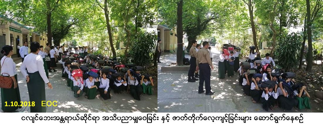 လူမှုဝန်ထမ်း၊ ကယ်ဆယ်ရေးနှင့် ပြန်လည်နေရာချထားရေးဝန်ကြီးဌာန၊ ဘေးအန္တရာယ်ဆိုင်ရာ စီမံခန့် ခွဲမှုဦးစီးဌာန၊ ရန်ကုန်တိုင်းဒေသကြီးဦးစီးမှူးရုံးမှ တာဝန်ရှိသူများသည် ရန်ကုန်တိုင်းဒေ သကြီး၊ အနော က်ပိုင်းခရိုင်၊ ကျောက်တံတားမြို့နယ်၊ အမှတ် (၁) အခြေခံပညာအထက်တန်းကျောင်း (ကျောက်တံတား) ၌ (၁-၁၀-၂၀၁၈) ရက်နေ့၊ နံနက်ပိုင်းတွင် ငလျင်ဘေးအန္တရာယ်ဆိုင်ရာ အသိပညာမျှဝေခြင်း နှင့် ဇာတ်တိုက်လေ့ကျင့်ခြင်းများ ပြုလုပ်ဆောင် ရွက်ခဲ့ရာ ဆရာ/ဆရာမ၊ ကျောင်းသား/သူ (၁၅၀) ဦး တက်ရောက်ခဲ့ကြောင်းသတင်းရရှိပါသည်။