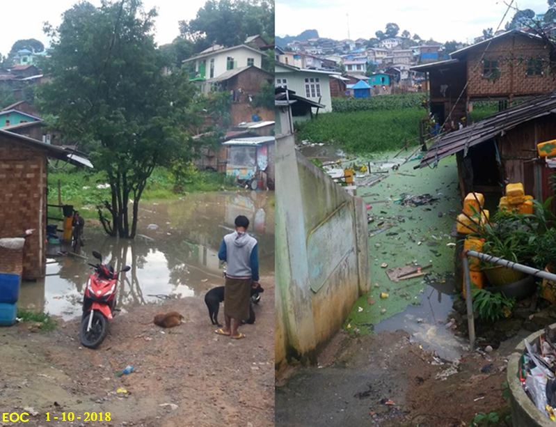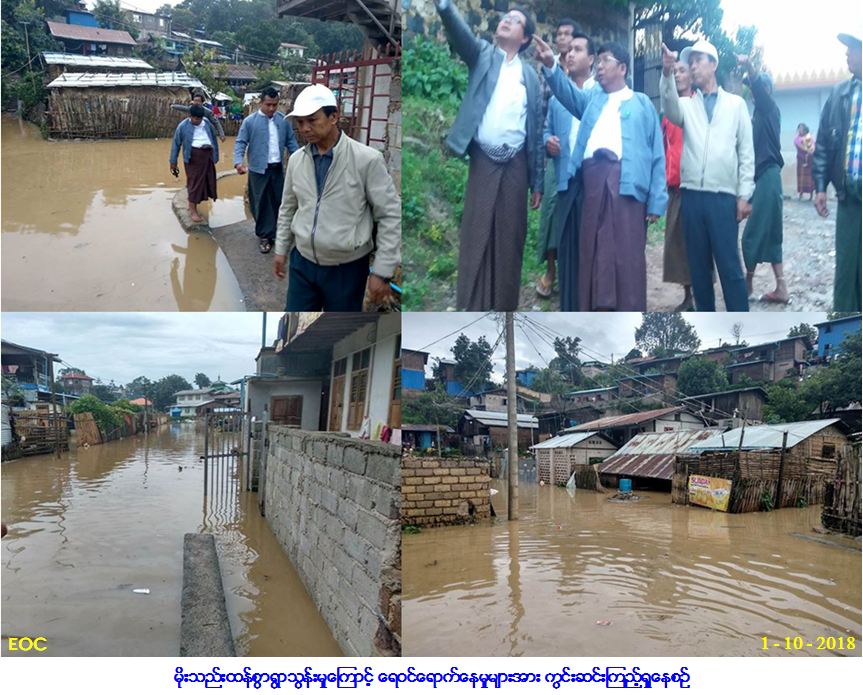 လူမှုဝန်ထမ်း၊ ကယ်ဆယ်ရေးနှင့်ပြန်လည်နေရာချထားရေးဝန်ကြီးဌာန၊ ဘေးအန္တရာယ်ဆိုင်ရာစီမံခန့်ခွဲမှုဦးစီးဌာန၊ ရှမ်း ပြည်နယ်ဦးစီးမှူးရုံးမှ တာဝန်ရှိသူများသည် (၁-၁၀-၂၀၁၈) ရက်နေ့၊ (၁၃း၃၀) နာရီအချိန်မှ (၁၅း၀၀) နာရီအချိန်ထိ တောင်ကြီးမြို့၌ မိုးသည်းထန်စွာရွာသွန်းမှုကြောင့် အနိမ့်ပိုင်းရပ်ကွက်ဖြစ်သည့် ချမ်းမြသာစည်ရပ်ကွက်တွင် ရေဝင် ရောက်နေမှုအခြေအနေအား ကွင်းဆင်းကြည့်ရှု့ခဲ့ပါကြောင်း၊ အိမ်ခြေ (၂၂) လုံးသို့ရေဝင်ရောက်ခဲ့ပြီး အိမ်ခြေ (၂) လုံးမှာ ရွှေ့ပြောင်းပေးထားပါကြောင်း၊ နေအိမ်အများစုမှာ ခြေတံရှည်အိမ်များဖြစ်ပြီး ထိခိုက်ဒဏ်ရာရရှိမှု/မရှိ ကြောင်း၊ အနိမ့်ဆုံး (၃) ပေခန့်မှ (၁၀) ပေကျော်ခန့်အထိ ရေနစ်မြုပ်နေပြီး ပစ္စည်းများထိခိုက်ဆုံးရှုံးမှုမရှိကြောင်း၊ ရေများ တဖြည်းဖြည်းကျဆင်းနေပါကြောင်း၊ လိုအပ်သည်များ ထောက်ပံ့ရေးနှင့် ရေရှည်အတွက် ပြင်ဆင်ဆောင်ရွက်ရန် ကိစ္စများ ညှိနှိုင်းတင်ပြဆောင်ရွက်သွားမည်ဖြစ်ကြောင်း သတင်းရရှိပါသည်။