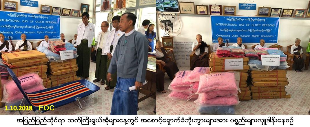 လူမှုဝန်ထမ်း၊ ကယ်ဆယ်ရေးနှင့် ပြန်လည်နေရာချထားရေးဝန်ကြီးဌာန၊ ဘေးအန္တရာယ် ဆိုင်ရာစီမံခန့်ခွဲ မှုဦးစီးဌာန၊ မွန်ပြည်နယ်ဦးစီးမှူးရုံးမှ တာဝန်ရှိသူများသည် ၂၀၁၈ခုနှစ်၊ အောက်တိုဘာလ (၁) ရက်နေ့ (အပြည်ပြည်ဆိုင်ရာ သက်ကြီးရွယ်အိုများနေ့) တွင် မော်လမြိုင်မြို့ရှိ အစောင့်ရှောက်ခံဘိုးဘွား (၁၀၀) ဦးအတွက် pillow, Bed sheet, Mosquito Net, Blanket, Foldable Bed ပစ္စည်း (၅) မျိုးတို့အား ထောက်ပံ့လှူဒါန်းခဲ့ကြောင်း သတင်းရရှိပါသည်။