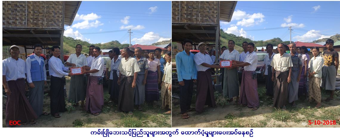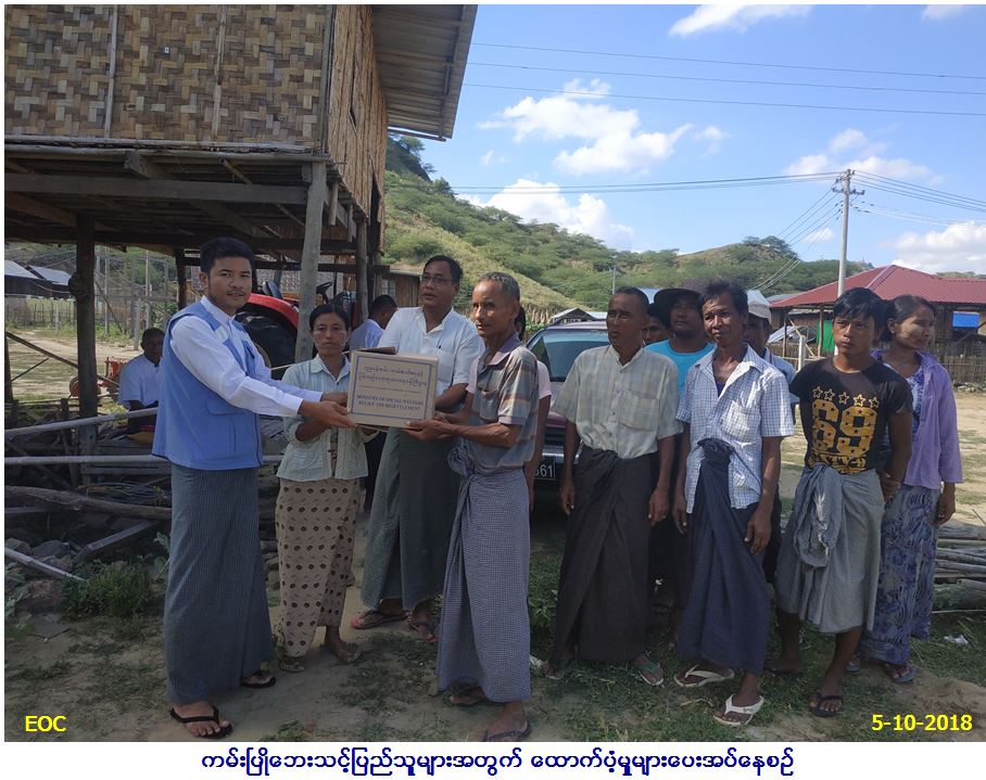 လူမှုဝန်ထမ်း၊ ကယ်ဆယ်ရေးနှင့်ပြန်လည်နေရာချထားရေးဝန်ကြီးဌာန၊ ဘေးအန္တရာယ်ဆိုင်ရာစီမံခန့်ခွဲမှုဦးစီးဌာန၊ ပခုက္ကူခရိုင်ဦးစီးမှူးရုံးမှ တာဝန်ရှိသူများသည် ပခုက္ကူမြို့နယ်၊ ဆိက္ခဝကျေးရွာအုပ်စု၊ အနောက်သီရိကျေးရွာတွင် (၃-၁၀-၂၀၁၈)ရက်နေ့တွင် ဖြစ်ပွားခဲ့သော ကမ်းပြို ဘေးကြောင့် ပြောင်းရွှေ့အိမ်ခြေ(၁၆)လုံး၊ အိမ်ထောင်စု(၁၆)စု၊ လူဦးရေ(၄၉)ဦးအတွက် ကယ်ဆယ်ရေး ပစ္စည်း(၉)မျိုး၊ အိမ်ဆောက်ပစ္စည်းဖိုး (၁၆၀၀၀၀၀/-)ကျပ်၊ ဆန်ရိက္ခာဖိုး (၁၀၂၉၀၀/-)ကျပ်၊ စုစုပေါင်း (၁၇၀၂၉၀၀/-)ကျပ်၊ (ကျပ်တစ်ဆယ့်ခုနှစ်သိန်းနှစ်ထောင့်ကိုးရာတိတိ) တို့အား (၅-၁၀-၂၀၁၈)ရက်နေ့တွင် ပခုက္ကူခရိုင်သဘာဝဘေးအန္တရာယ်ဆိုင်ရာစီမံခန့်ခွဲမှုကော်မတီအဖွဲ့ဝင် ပြန်ကြားရေးနှင့် ပြည်သူ့ဆက်ဆံ ရေးဦးစီးဌာနမှ ခရိုင်ဦးစီးမှူး ဦးဇော်ဌေးအောင်၊ ရွှေကန်မြေလူမှုကူညီရေးအသင်း ဥက္ကဌဦးသန်းကျော်သူ၊ ပခုက္ကူဂျာနယ်မှ အယ်ဒီတာဦး နေဦးမောင်၊ ဆိက္ခဝကျေးရွာအုပ်ချုပ်ရေးမှူး ဦးအောင်လွင်တို့နှင့်အတူ ဘေးသင့်ပြည်သူများ၏ လက်ဝယ်အရောက်ထောက်ပံ့ပေးအပ်ခဲ့ ကြောင်း သတင်းရရှိပါသည်။