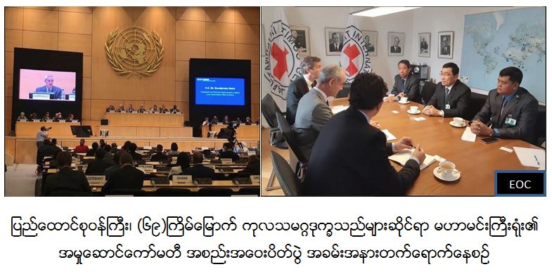 လူမှုဝန်ထမ်း၊ ကယ်ဆယ်ရေးနှင့်ပြန်လည်နေရာချထားရေးဝန်ကြီးဌာန ပြည်ထောင်စု ဝန်ကြီး၊ UEHRD ဒုတိယဥက္ကဌ ဒေါက်တာဝင်းမြတ်အေးသည် ဆွစ်ဇာလန်နိုင်ငံ၊ ဂျီနီဗာမြို့တွင် အောက်တိုဘာ ၁ ရက်မှ ၅ ရက်နေ့ထိ ကျင်းပပြုလုပ်ခဲ့သော (၆၉) ကြိမ်မြောက် ကုလသမဂ္ဂဒုက္ခသည်များဆိုင်ရာမဟာမင်းကြီးရုံး၏ အမှုဆောင်ကော်မတီ အစည်းအဝေးပိတ်ပွဲအခမ်းအနားသို့ ကုလသမဂ္ဂဆိုင်ရာ မြန်မာကိုယ်စားလှယ်အဖွဲ့ရုံးမှ အဖွဲ့ရုံး ယာယီတာဝန်ခံဦးအောင်မျိုးမြင့်၊ တာဝန်ရှိသူများနှင့်အတူ တက်ရောက်ခဲ့ပါသည်။ အဆိုပါအစည်းအဝေးကို နိုင်ငံပေါင်း(၁၄၁)နိုင်ငံမှ ကိုယ်စားလှယ်များ တက်ရောက် ခဲ့ရာ မြန်မာကိုယ်စားလှယ်အဖွဲ့ခေါင်းဆောင် ပြည်ထောင်စုဝန်ကြီးက အောက်တိုဘာလ (၁)ရက်နေ့တွင် မိန့်ခွန်းပြောကြားခဲ့ရာ နိုင်ငံတော်အစိုးရ၏ ၂၀၁၆ခုနှစ် တာဝန်ယူချိန်မှစ၍ ရခိုင်ပြည်နယ်ဖွံ့ဖြိုးတိုးတက်ရေးအတွက်ဆောင်ရွက်မှု၊ အကြမ်းဖက်ဖြစ်စဉ်တိုက်ခိုက်မှု ဖြစ်စဉ်နောက်ပိုင်း ဒေသနေအသိုက်အဝန်းအားလုံးမှ ပဋိပက္ခ၏ နောက်ဆက်တွဲ အကြပ်အတည်းများကြုံတွေ့နေရမှု၊ ရခိုင်ပြည်နယ်တွင် ငြိမ်းချမ်းရေးနှင့်ပုံမှန်အခြေအနေ ပြန်လည်ရရှိရေး၊ လူမှုသဟဇာတရရှိစေရေးဆောင်ရွက်နေမှုနှင့် တွေ့ကြုံရသည့် အခက် အခဲများ၊ UEHRD ပြည်ထောင်စုစီမံကိန်း၏ လုပ်ငန်းဆောင်ရွက်နေမှု၊ ရခိုင်ပြည်နယ် ဆိုင်ရာအကြံပြုချက်များအား အကောင်အထည်ဖော်မှု၊ ဘင်္ဂလားဒေ့ရှ်အစိုးရနှင့် နှစ်နိုင်ငံ သဘောတူညီချက်အရ ဆောင်ရွက်ထားရှိမှုအခြေအနေ၊ UNDP -UNHCR တို့နှင့် ပူးပေါင်း ဆောင်ရွက်မှုများ၊ လွတ်လပ်သောစုံစမ်းရေးကော်မရှင်ဖွဲ့စည်းဆောင်ရွက်မှု၊ မြန်မာနိုင်ငံ တွင်နေထိုင်ခဲ့ကြောင်း အတည်ပြုပြီးသူများ၊ ၎င်းတို့၏ဆန္ဒအလျောက် မြန်မာနိုင်ငံသို့ ပြန်လည်ဝင်ရောက်ချိန်တွင် လုံခြုံပြီးလူသားဂုဏ်သိက္ခာရှိရှိ ဝင်ရောက်ခွင့်ရစေရန် ပွင့်လင်း မြင်သာစွာနှင့် ကောင်းမွန်သည့်အရင်းခံစိတ်ဓါတ်ဖြင့် ဆောင်ရွက်နေမှုတို့ကို ပြောကြားခဲ့ ပါသည်။ မြန်မာနိုင်ငံအား ပံ့ပိုးကူညီလိုသည့် နိုင်ငံတကာမိတ်ဖက်များ၊ မိတ်ဖက်အပြည် ပြည်ဆိုင်ရာအဖွဲ့အစည်းများ၏ ကိုယ်စားလှယ်အဖွဲ့ခေါင်းဆောင်များနှင့်လည်းတွေ့ဆုံ ဆွေးနွေးခြင်း၊ မြန်မာနိုင်ငံအစိုးရက ဆောင်ရွက်နေသည့် ကျယ်ပြန့်သော ပြန်လည် ထူထောင်ရေးလုပ်ငန်းစဉ်အတွက်ပူးပေါင်းကူညီနိုင်ရေးညှိနှိုင်းဆွေးနွေးခြင်းများဆောင်ရွက်ခဲ့ပါသည်။ ပြည်ထောင်စုဝန်ကြီးသည် အောက်တိုဘာ ၄ ရက်နေ့ ဒေသစံတော်ချိန် (၁၀း၀၀) နာရီ တွင်အပြည်ပြည်ဆိုင်ရာကြက်ခြေနီနှင့် လခြမ်းနီများအသင်း ဒုတိယဥက္ကဌ Mr. Gilles Carbonnier နှင့် ဂျီနီဗာမြို့ရှိ ICRC ရုံးချုပ်တွင် တွေ့ဆုံဆွေးနွေးခဲ့ပါသည်။ ပြည်ထောင်စု ဝန်ကြီးက မြန်မာန