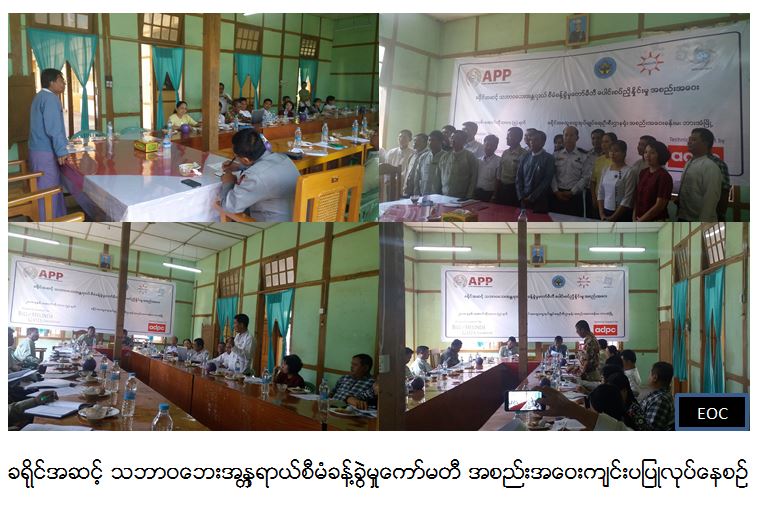 ခရိုင်အဆင့် သဘာဝဘေးအန္တရာယ်စီမံခန့်ခွဲမှုကော်မတီ အစည်းအဝေး ကို (၅-၁၀-၂၀၁၈) ရက်နေ့က ကရင်ပြည်နယ်၊ ဘားအံခရိုင် အထွေထွေအုပ်ချုပ်ရေးဦးစီးဌာနတွင် ကျင်းပပြုလုပ်ခဲ့ပါသည်။ အဆိုပါ အစည်းအဝေးတွင် မြန်မာဘေးအန္တရာယ် ကြိုတင်ပြင်ဆင်မှု မိတ်ဖက်အဖွဲ့ MPP မှ ဘေးအန္တရာယ်ဆိုင်ရာ ရှေ့ဆက်ဆောင်ရွက် ပူးပေါင်းဆောင်ရွက်မည့် လုပ်ငန်းစဉ်များကို ခရိုင်သဘာဝဘေးအန္တရာယ် စီမံခန့်ခွဲမှု ကော်မတီသို့ တင်ပြဆွေးနွေးခဲ့ပြီး သက်ဆိုင်ရာ ဌာနဆိုင်ရာမှ ကိုယ်စားလှယ်များက ပါဝင်ဆွေးနွေးခဲ့ကြပါသည်။ အဆိုပါ အစည်းအဝေးကို နံနက် ၉း၀၀ နာရိမှ နေ့လည် ၁၂း၃၀ အထိ ပြုလုပ်ခဲ့ပြီး ဘေးအန္တရာယ်ဆိုင်ရာစီမံခန့်ခွဲမှုဦးစီးဌာန၊ ကရင်ပြည်နယ် ဦးစီးမှူး၊ ဦးလင်းထွဋ်၊ ဘားအံခရိုင်အထွေထွေအုပ်ချုပ်ရေးဦးစီးဌာနမှ၊ ခရိုင်အုပ်ချုပ်ရေး မှူး၊ Asia Disaster Preparedness Center (ADPC)၊ Myanmar Prepardness Partnership (MPP) တို့နှင့် ဌာနဆိုင်ရာမှ ကိုယ်စားလှယ်များ စုစုပေါင်း (၃၀)ဦး တက်ရောက်ခဲ့ကြကြောင်း သတင်းရရှိပါသည်။