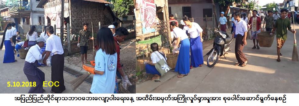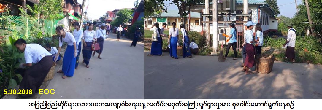 လူမှုဝန်ထမ်း၊ ကယ်ဆယ်ရေးနှင့် ပြန်လည်နေရာချထားရေးဝန်ကြီးဌာန၊ ဘေးအန္တရာယ် ဆိုင်ရာစီမံခန့်ခွဲ မှုဦးစီးဌာန၊ မွန်ပြည်နယ်ဦးစီးမှူးရုံးမှတာဝန်ရှိသူများသည် မော်လမြိုင်မြို့နယ် အတွင်းရှိ သဘာဝဘေး လျော့ပါးရေးစေတနာ့ဝန်ထမ်းလူငယ်များ၊ မြို့နယ်အထွေထွေအုပ်ချုပ်ရေး ဦးစီးဌာနနှင့်အတူ ၂၀၁၈ခုနှစ်၊ အပြည်ပြည်ဆိုင်ရာသဘာဝဘေးလျော့ပါးရေးနေ့ အထိမ်းအမှ တ်အကြိုလှုပ်ရှားမှုအဖြစ် မော်လမြိုင်မြို့၊ သီရိမြိုင်ရပ်ကွက်ရှိ ပိတ်ဆို့နေသောရေမြောင်းများ အားရှင်းလင်းခြင်း၊ အမှိုက်များဆည်ယူခြင်း၊ ခြုံနွယ်ပိ တ်ပေါင်းများရှင်းလင်းခြင်း၊ သဘာဝဘေး အသိပညာပေး လက်ကမ်းစာစောင်များဖြန့်ဝေခြင်းစသည့် လုပ်ငန်းများအား (၅-၁၀-၂၀၁၇) ရက်နေ့၊ (ဝရး၃၀) နာရီအချိန်တွင် စတင်ဆောင်ရွက်ခဲ့ကြောင်း သတင်းရရှိပါသည်။
