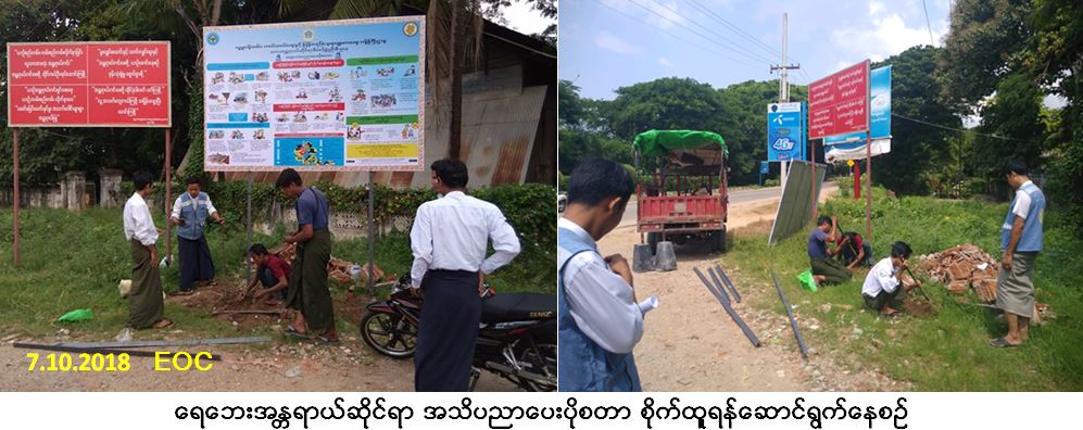လူမှုဝန်ထမ်း၊ ကယ်ဆယ်ရေးနှင့် ပြန်လည်နေရာချထားရေးဝန်ကြီးဌာန၊ ဘေးအန္တရာယ်ဆိုင်ရာ စီမံခန့်ခွဲ မှုဦးစီးဌာန၊ ပြည်ခရိုင်ဦးစီးမှူးရုံးမှတာဝန်ရှိသူများသည် ပြည်သူများ သဘာဝဘေး အန္တရာယ် အသိပညာတိုးပွားစေရေးအတွက် ရေဘေးအန္တရာယ်ဆိုင်ရာ အသိပညာပေးပိုစတာအား (၇-၁၀-၂၀၁၈) ရက်နေ့၊ (၁၂း၀၀) နာရီချိန်တွင် ပဲခူးတိုင်းဒေသကြီး၊ ပြည်ခရိုင်၊ ရွှေတောင်မြို့၊ ဆေးရုံလမ်းနှင့် ရန်ကုန်ပြည်လမ်းဆုံနေရာ၌ စိုက်ထူခဲ့ကြောင်းသတင်း ရရှိပါသည်။