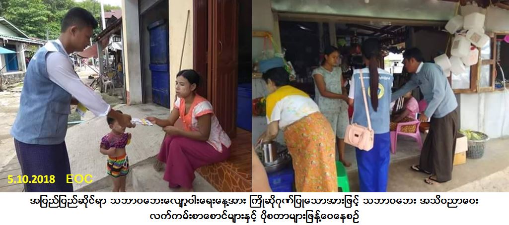 လူမှုဝန်ထမ်း၊ ကယ်ဆယ်ရေးနှင့် ပြန်လည်နေရာချထားရေးဝန်ကြီးဌာန၊ ဘေးအန္တရာယ် ဆိုင်ရာစီမံခန့်ခွဲ မှုဦးစီးဌာန၊ ကော့သောင်းခရိုင်ဦးစီးမှူးရုံးမှ ဝန်ထမ်းများစုပေါင်း၍ ပုလုံးတုံတုံးရွာနှင့် ချောင်းဝက ျေးရွာတို့၌ (၁၃-၁၀-၂၀၁၈) ရက်နေ့တွင်ကျရောက်မည့် အပြည်ပြည်ဆိုင်ရာ သဘာဝဘေးလျော့ပါးရေးနေ့အား ကြိုဆိုဂုဏ်ပြုသောအားဖြင့် (၅-၁၀-၂၀၁၈) ရက်နေ့တွင် သဘာဝဘေး အသိပညာပေး လက်ကမ်းစာ စောင်များနှင့် ပိုစတာများအား ရွာသူ/သားများလက်ဝယ်သို့ သွားရောက်ဖြန့်ဝေခဲ့ခြင်းနှင့် ရှင်းလင်းပြော ကြားခြင်းများဆောင်ရွက်ခဲ့ကြောင်း သတင်းရရှိပါသည်။