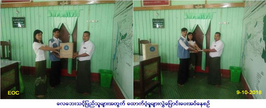 လူမှုဝန်ထမ်း၊ ကယ်ဆယ်ရေးနှင့်ပြန်လည်နေရာချထားရေးဝန်ကြီးဌာန၊ ဘေးအန္တရာယ်ဆိုင်ရာစီမံခန့်ခွဲမှုဦးစီးဌာန၊ သရက်ခရိုင်ဦးစီးမှူးရုံးမှ တာဝန်ရှိသူများသည် အောင်လံမြို့နယ်၊ ပြလို့ကျေးရွာအုပ်စု၊ ပြင်းပေါက်ကျေးရွာတွင် (၈.၁၀.၂၀၁၈)ရက်နေ့၊ (၁၃း၅၀)နာရီမှ (၁၃း၆၀)နာရီအချိန်အထိ လေပြင်းတိုက်ခတ်မှုကြောင့် နေအိမ်(၁)လုံးအမိုးလန်ခဲ့ပြီး အိမ်ထောင်စု(၁)စု၊ လူဦးရေ စုစုပေါင်း(၇)ဦး ဘေးသင့်ခဲ့ရာ ဘေးသင့်လူဦးရေ (၇)ဦးအတွက် ဆန်ရိက္ခာဖိုး(၇)ရက်စာ (၁၄၇၀၀/-)ကျပ်နှင့် နေအိမ်(၁)လုံးအတွက် အိမ်ဆောက်ပစ္စည်းဖိုး (၃၀၀၀၀/-)ကျပ်၊ ရန်ပုံငွေစုစုပေါင်း (၄၄၇၀၀/-)ကျပ်နှင့် ကယ်ဆယ်ရေးပစ္စည်း(၉)မျိုး (၁)အိမ်ထာင်စာတို့အား (၉.၁၀.၂၀၁၈)ရက်နေ့တွင် အောင်လံမြို့နယ်အထွေထွေအုပ်ချုပ်ရေးဦးစီးဌာနမှ တာဝန်ရှိသူများ၏ရှေ့မှောက်တွင် ပြင်းပေါက်ကျေးရွာစာရေးလက်ဝယ်သို့ သွားရောက် ထောက်ပံ့ပေးအပ်ခဲ့ကြောင်း သတင်းရရှိပါသည်။