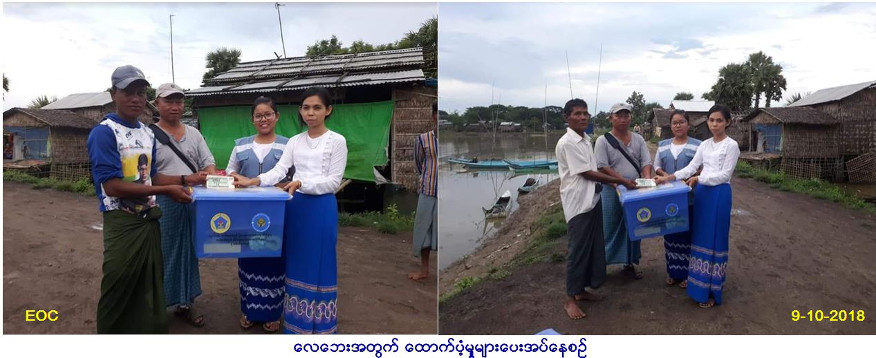 လူမှုဝန်ထမ်း၊ ကယ်ဆယ်ရေးနှင့်ပြန်လည်နေရာချ ထားရေးဝန်ကြီးဌာန၊ ဘေးအန္တရာယ်ဆိုင်ရာစီမံ ခန့်ခွဲမှုဦးစီးဌာန၊ ဧရာဝတီတိုင်းဒေသကြီး ဦးစီးမှူးရုံးဦးစီးမှူးရုံးမှ တာဝန်ရှိသူများသည် ဧရာဝတီတိုင်းဒေသကြီး၊ ပုသိမ်ခရိုင်၊ သာပေါင်းမြို့နယ်၊ စစ်ပင်ကြီးကျေးရွာအုပ်စု စစ်ပင်ကြီး ကျေးရွာ၌ (၆-၁၀-၂၀၁၈)ရက်နေ့တွင် ဖြစ်ပွားခဲ့သော လေဘေးကြောင့် အမိုးလန်ပျက်စီးနေအိမ် (၃) လုံး အိမ်ထောင်စု (၃)စုမှ လူဦးရေ (၁၂) ဦးအတွက် အိမ်ဆောက်ပစ္စည်း ဖိုးငွေကျပ် (၁၅၀၀၀၀/-)၊ ဆန်ရိက္ခာရန်ပုံငွေ (၂၅၂၀၀/-)၊ စုစုပေါင်းရန်ပုံငွေ (၁၇၅၂၀၀/-)ကျပ်နှင့် ကယ်ဆယ် ရေးပစ္စည်း (၁၁)မျိုး (၃)အိမ်ထောင်စာ (၅၅၅၃၀/-)ကျပ်တို့အား လေဘေးသင့်ပြည်သူများ ထံသို့ ကျေးရွာအုပ်ချုပ်ရေးမှူးရပ်မိရပ်ဖများ၏ ရှေ့မှောက်၌ (၉-၁၀-၂၀၁၈)ရက်နေ့ (၁ရး၃၀)နာရီအချိန်တွင် ထောက်ပံ့ပေးအပ်ခဲ့ကြောင်း သတင်းရရှိပါသည်။