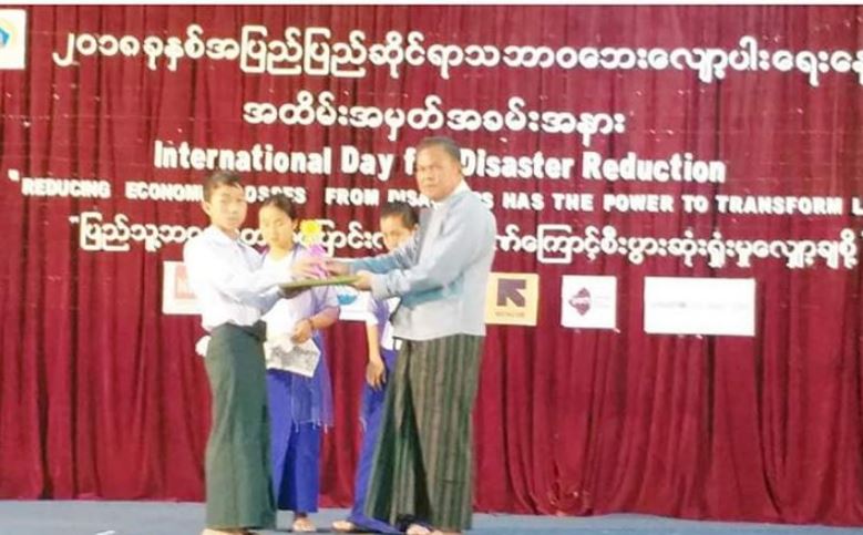 ဆက်လက်၍ ကုလမဂ္ဂမှပေးပို့သောသဝဏ်လွှာကိုဘေးအန္တရာယ်ဆိုင်ရာစီမံခန့်ခွဲမှုဦးစီးဌာန၊ ပြည်နယ်ဦးစီးမှူးက ဖတ်ကြားခဲ့ကြောင်း၊ ထို့နောက်၂၀၁၈ခုနှစ်၊ အပြည်ပြည်ဆိုင်ရာသဘာဝဘေးလျော့ပါးရေးနေ့ အထိမ်းအမှတ် စာစီစာကုံးနှင့် ပန်းချီပြိုင်ပွဲတွင် ဆုရရှိသောကျောင်သူ/သားများအား ကယားပြည်နယ်တရားသူကြီးချုပ် ဦးကျော်လင်းမောင်မှလည်းကောင်း၊ စည်ပင်သာယာရေးနှင့် လူမှုရေးဝန်ကြီးဒေါက်တာအောင်ကျော်ဌေးမှ လည်းကောင်း၊ ပြည်နယ်ရွေးကောက်ပွဲကော်မရှင်ဥက္ကဌမှလည်းကောင်း၊ ဘေးအန္တရာယ်ဆိုင်ရာစီမံခန့်ခွဲမှုဦးစီးဌာန၊ ပြည်နယ်ဦးစီးမှူးမှလည်းကောင်းဆုများအသီးသီးပေးအပ်ချီးမြှင့်အပြီးတွင် ဘေးအန္တရာယ်ဆိုင်ရာဗီဒီယို ပြသခဲ့ပြီးနောက် တက်ရာက်လာသူများက ပြသထားသည့်နံရံကပ်ဓါတ်ပုံများကိုကြည့်ရှု ခဲ့ကြကြောင်းသတင်းရရှိပါသည်။