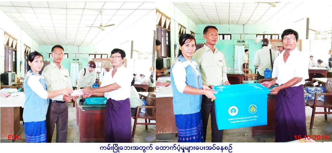 လူမှုဝန်ထမ်း၊ ကယ်ဆယ်ရေးနှင့်ပြန်လည်နေရာချ ထားရေးဝန်ကြီးဌာန၊ ဘေးအန္တရာယ်ဆိုင်ရာစီမံ ခန့်ခွဲမှုဦးစီးဌာန၊ ဟင်္သာတခရိုင်ဦးစီးမှူးရုံးမှ တာဝန်ရှိသူများသည် ဇလွန်မြို့နယ်အတွင်းရှိ (၁၁.၁၀.၂၀၁၈)ရက်နေ့တွင် ညောင်ပင်သာအုပ်စု၊ ရေပေါက်ကြီးကျေးရွာ၌ ဖြစ်ပွားခဲ့သော ကမ်းပြိုမှုကြောင့် ဘေးလွတ်ရာသို့ရွှေ့ပြောင်းကြ ရသော အိမ်ခြေ(၄) လုံးတို့အတွက် အိမ်ဆောက်ပစ္စည်း (၄၀၀၀၀၀/-) ဘေးသင့် လူဦးရေ(၁၉) ဦးအတွက် ဆန်ရိက္ခာ (၇) ရက်စာ ရန်ပုံငွေ( ၃၉၉၀၀/-)စုစုပေါင်းရန်ပုံငွေ (၄၃၉၉၀၀/-) ကယ်ဆယ်ရေးပစ္စည်း (၁၀)မျိုး (၄)အိမ်ထောင်စာ( တန်ဖိုး-၇၄၀၄၀/-) စုစုပေါင်း ထောက်ပံ့မှု တန်ဖိုး(၅၁၃၉၄၀/-) ကျပ်တို့အား (၁၅.၁၀.၂၀၁၈)ရက်နေ့တွင် ဇလွန်မြို့နယ်၊ အထွေထွေအုပ်ချုပ် ရေးဦးစီးဌာန၌ တာဝန်ရှိသူများနှင့်အတူ ကမ်းပြိုဘေးသင့်ပြည်သူများ လက်ဝယ်သို့ ထောက်ပံ့ပေးအပ်ခဲ့ကြောင်း သတင်းရရှိပါသည်။