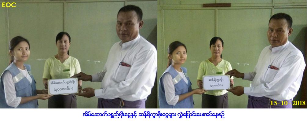 လူမှုဝန်ထမ်း၊ ကယ်ဆယ်ရေးနှင့်ပြန်လည်နေရာချထားရေးဝန်ကြီးဌာန၊ ဘေးအန္တရာယ်ဆိုင်ရာစီမံခန့်ခွဲမှုဦးစီးဌာန၊ ရေစကြို မြို့နယ်ဦးစီးမှူးရုံးမှ တာဝန်ရှိသူများသည် ပခုက္ကူခရိုင်၊ ရေစကြိုမြို့နယ်၊ ကွေ့ထောင့်ကျေးရွာအုပ်စု၊ ကွေ့ထောင့်ကျေးရွာ၌ (၁၅-၁၀-၂၀၁၈) ရက်နေ့၊ (၁၁း၀၀) နာရီအချိန်တွင် ဧရာဝတီမြစ်ရေတိုက်စား ကမ်းပါးပြိုကျမှုကြောင့် ကြိုတင်ဖျက်သိမ်းပြောင်းရွှေ့ နေအိမ် (၃) လုံး၊ အိမ်ထောင်စု (၅) စု၊ လူဦးရေ (၁၈) ဦးတို့အတွက် ကယ်ဆယ်ရေးပစ္စည်း (၉) မျိုး၊ ဆန်ရိက္ခာဖိုးငွေ (၃၇,၈၀၀/-) ကျပ်နှင့် အိမ်ဆောက်ပစ္စည်းဖိုးငွေ (၃၀၀,၀၀၀/-) ကျပ်၊ စုစုပေါင်းထောက်ပံ့ငွေ (၃၃၇,၈၀၀/-) ကျပ်တို့အား (၁၅-၁၀-၂၀၁၈) ရက်နေ့တွင် ရေစကြိုမြို့နယ်၊ အထွေထွေအုပ်ချုပ်ရေးဦးစီးဌာနရုံး၌ တာဝန်ရှိသူများနှင့်အတူ ကွေ့ထောင့်ကျေးရွာအုပ်ချုပ်ရေးမှူး လက်ဝယ်အရောက် ထောက်ပံ့ပေးအပ်ခဲ့ကြောင်း သတင်းရရှိပါသည်။