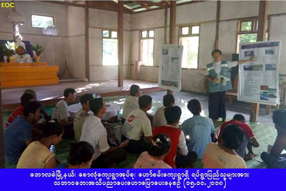 လူမှုဝန်ထမ်း၊ ကယ်ဆယ်ရေးနှင့်ပြန်လည်နေရာချထားရေးဝန်ကြီးဌာန၊ ဘေးအန္တရာယ်ဆိုင်ရာစီမံခန့်ခွဲမှုဦးစီးဌာန၊ ဘောလခဲခရိုင် ဦးစီးမှူးရုံးမှတာဝန်ရှိသူများသည် (၁၅-၁၀-၂၀၁၈) ရက်နေ့တွင် ဘောလခဲမြို့နယ်၊ စောလုံကျေးရွာအုပ်စု၊ ဟော်ခမ်းကျေးရွာရှိ ရပ်ရွာပြည်သူလူထု (၁၀၀) ဦးအား သဘာဝဘေးအသိပညာပေးဟောပြောပေးခဲ့ပြီး တက်ရောက်သူများအား အသိပညာပေး လက်ကမ်းစာစောင်များဝေငှပေးခဲ့ကြောင်း သတင်းရရှိပါသည်။