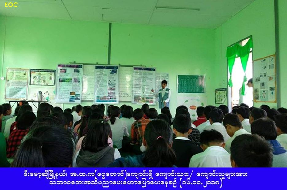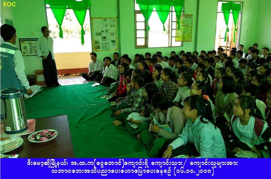 လူမှုဝန်ထမ်း၊ ကယ်ဆယ်ရေးနှင့်ပြန်လည်နေရာချထားရေးဝန်ကြီးဌာန၊ ဘေးအန္တရာယ်ဆိုင်ရာစီမံခန့်ခွဲမှုဦးစီးဌာန၊ ဘောလခဲခရိုင် ဦးစီးမှူးရုံးမှတာဝန်ရှိသူများသည် (၁၆-၁၀-၂၀၁၈) ရက်နေ့တွင် ဒီးမော့ဆိုမြို့နယ်၊ အ.ထ.က (ငွေတောင်) ကျောင်းရှိ ကျောင်းသား/သူ စုစုပေါင်း (၁၈၀) ဦးအား သဘာဝဘေးအသိပညာပေးဟောပြောပေးခဲ့ပြီး တက်ရောက်သူများအား အသိ ပညာပေးလက်ကမ်းစာစောင်များဝေငှပေးခဲ့ကြောင်း သတင်းရရှိပါသည်။