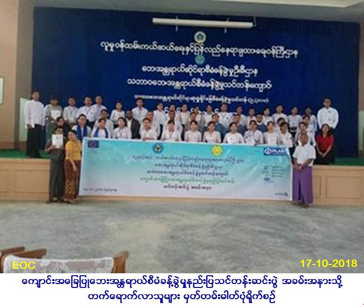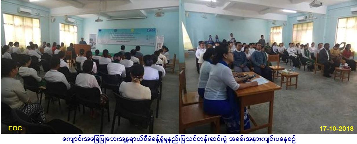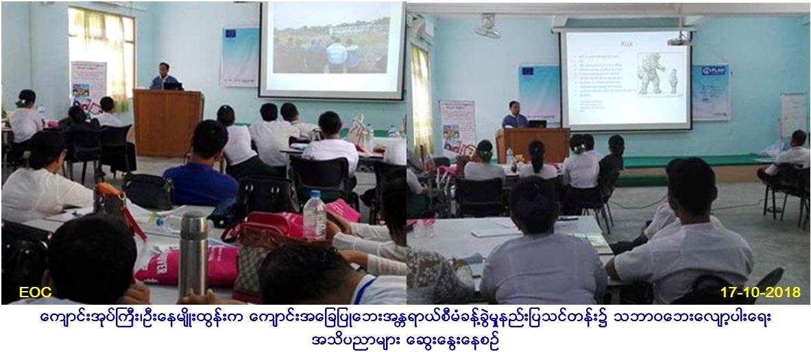 လူမှုဝန်ထမ်း၊ ကယ်ဆယ်ရေးနှင့်ပြန်လည်နေရာချထားရေးဝန်ကြီးဌာန၊ ဘေးအန္တရာယ်ဆိုင်ရာစီမံခန့်ခွဲမှုဦးစီးဌာန၊ သဘာဝဘေးအန္တရာယ်စီမံ ခန့်ခွဲမှုသင်တန်းကျောင်းမှ တာဝန်ရှိသူများသည် ဟင်္သာတမြို့၌ (၁၇.၁၀.၂၀၁၈)ရက်နေ့ (၁၃း၃၀)နာရီအချိန်တွင် ကျောင်းအခြေပြုဘေးအန္တရာယ်စီမံခန့်ခွဲမှုနည်းပြသင်တန်းဆင်း အခမ်းအနားကျင်းပခဲ့ရာ သင်တန်းကျောင်းကျောင်းအုပ်ကြီးမှ အမှာစကားပြောကြားခဲ့ပြီး ခရိုင် အဆင့်ဌာနဆိုင်ရာများ၊ သင်တန်းနည်းပြများ၊ MCCR မှ Mr Lafir ၊ Plan International Myanmar မှ တာဝန်ရှိသူများနှင့် သင်တန်း သား/သူ(၄၀)ဦး၊ စုစုပေါင်း (၅၅)ဦးခန့်တက်ရောက်ခဲ့ကြောင်း သတင်းရရှိပါသည်။