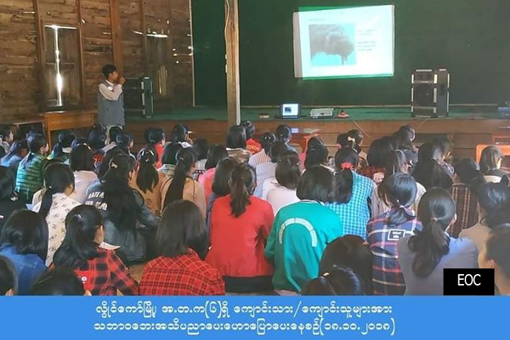လူမှုဝန်ထမ်း၊ ကယ်ဆယ်ရေးနှင့် ပြန်လည်နေရာချထားရေးဝန်ကြီးဌာန၊ ဘေးအန္တရာယ်ဆိုင်ရာစီမံခန့်ခွဲမှုဦးစီးဌာန၊ ကယားပြည်နယ်ဦးစီးမှူးရုံးမှ တာဝန်ရှိသူများသည် (၁၈-၁၀-၂၀၁၈) ရက်နေ့တွင် လွိုင်ကော်မြိုနယ်၊ အ.ထ.က(၆)ကျောင်းရှိ ကျောင်းသား/ ကျောင်းသူ(၁၈၀)ဦးအား သဘာဝဘေးအသိပညာပေးဟောပြောပေးခဲ့ပြီး တက်ရောက်သူများအား လက်ကမ်းစာစောင်များဝေငှခဲ့ကြောင်း သိရှိရပါသည်။