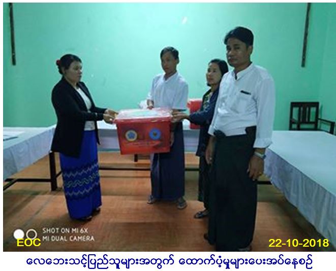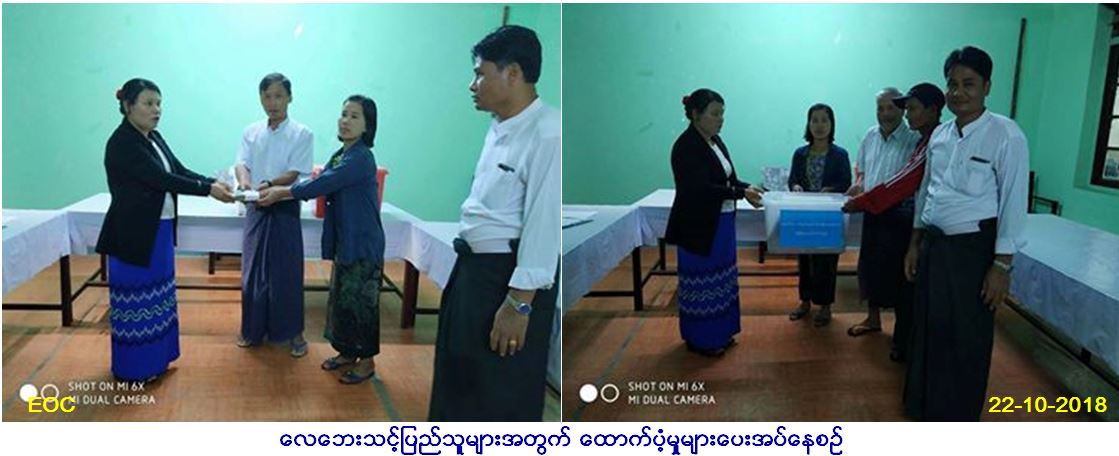 လူမှုဝန်ထမ်း၊ ကယ်ဆယ်ရေးနှင့်ပြန်လည်နေရာ ချထားရေးဝန်ကြီးဌာန၊ ဘေးအန္တရာယ်ဆိုင်ရာစီမံ ခန့်ခွဲမှုဦးစီးဌာန၊ ကျိုက်ထိုမြို့နယ်ဦးစီးမှူးရုံး မှ တာဝန်ရှိသူများသည် ကျိုက်ထိုမြို့နယ် ကဒိုင်ဒွတ်ကျေးရွာအုပ်စုနှင့် ဖ ္ကက္ကလိပ်ကျေးရွာအုပ်စု တို့တွင် (၂၀-၁၀-၂၀၁၈) ရက်နေ့ဖြစ်ပွားခဲ့သော မိုးသည်းထန်စွာရွာသွန်းပြီးလေပြင်းတိုက်ခတ်မှုကြောင့် ဘေးသင့် တစ်စိတ်တစ်ပိုင်းပျက်စီးနေအိမ် (၁)လုံးအတွက် ကယ်ဆယ်ရေးပစ္စည်း (၁၁)မျိုး (၁) အိမ်ထောင်စာ၊ ပြိုကျအိမ်(၂)လုံးအတွက် ကယ်ဆယ်ရေးပစ္စည်း(၁၅)မျိုး (၂)အိမ်ထောင်စာ အိမ်ဆောက်ပစ္စည်းဖိုးငွေ (၄၀၀၀၀၀/-) ကျပ်နှင့် လူဦးရေ (၁၂)ဦးအတွက် ဆန်ရိက္ခာဖိုးငွေ (၇) ရက်စာ (၂၅၂၀၀/-)ကျပ်၊ စုစုပေါင်းထောက်ပံ့ငွေ (၄၂၅၂၀၀/-)ကျပ်တို့ အား (၂၂-၁၀-၂၀၁၈)ရက်နေ့တွင် ကျိုက်ထိုမြို့နယ် အထွေထွေအုပ်ချုပ်ရေးဦးစီးဌာနအစည်းအဝေးခန်းမတွင် ဘေးသင့်ပြည်သူများ လက်ဝယ် အရောက် ထောက်ပံ့ပေးအပ်ခဲ့ကြောင်း သတင်းရရှိပါသည်။