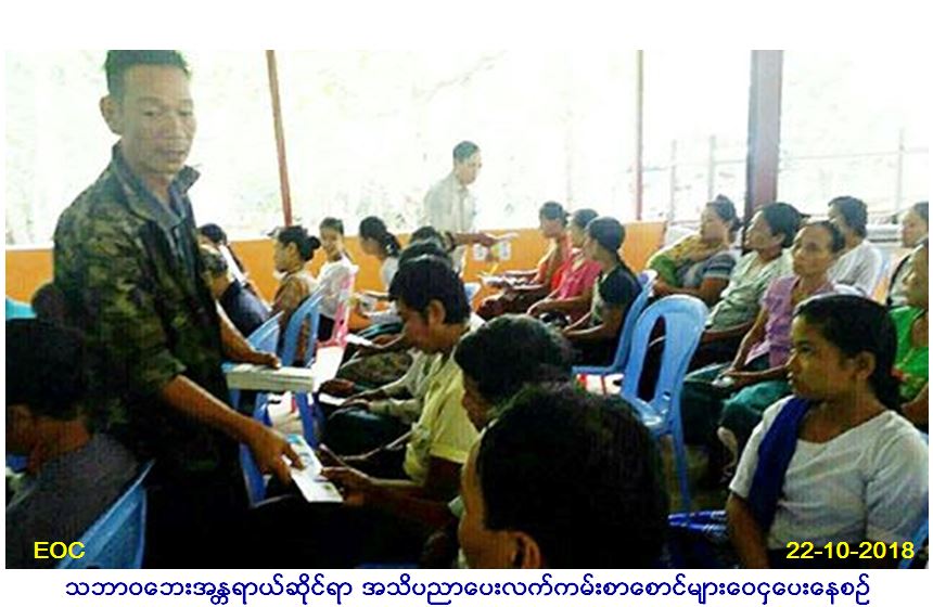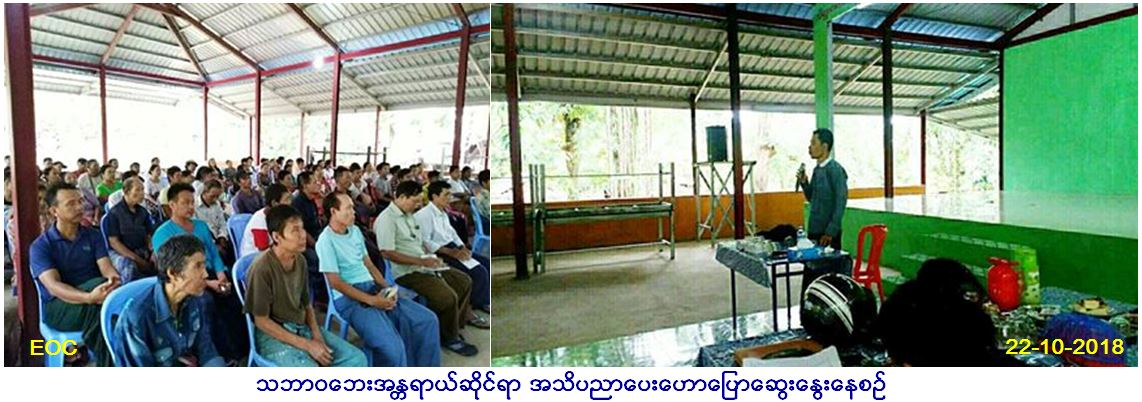 လူမှုဝန်ထမ်း၊ ကယ်ဆယ်ရေးနှင့်ပြန်လည်နေရာချ ထားရေးဝန်ကြီးဌာန၊ ဘေးအန္တရာယ်ဆိုင်ရာစီမံ ခန့်ခွဲမှုဦးစီးဌာန၊ မြောင်းမြခရိုင်ဦးစီးမှူးရုံးမှ တာဝန်ရှိသူများသည် (၂၂.၁၀.၂၀၁၈)ရက်နေ့တွင် (၁၀း၀၀)နာရီမှ(၁၁း၀၀)နာရီထိ မြောင်းမြမြို့နယ်၊ သိလ္လာကျေးရွာအုပ်စု၊ သိလ္လာကျေးရွာ တွင် ပြည်သူလူထုစုစုပေါင်း (၁၀၀)ဦးခန့်အား သဘာဝဘေးနှင့်ပတ်သက်သော အသိပညာများဖြန့်ဝေပေးခြင်းနှင့် ဆောင်ရန်/ ရှောင်ရန်များ ဟောပြောဆွေးနွေးခဲ့ပြီး လက်ကမ်းစာစောင်များဝေငှပေးခဲ့ကြောင်း သတင်းရရှိပါသည်။