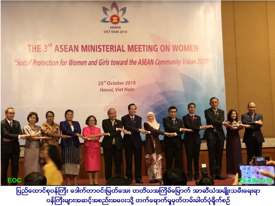 ထို့နောက် တတိယအကြိမ်မြောက် အာဆီယံအမျိုးသမီးရေးရာဝန်ကြီးအဆင့် အစည်းအဝေးကို ဆက်လက်ကျင်းပရာ အမျိုးသမီး များနှင့် အမျိုးသမီးငယ်ရွယ်များအတွက် လူမှုကာကွယ်စောင့်ရှောက်ရေး၊ လူမှုဖူလုံရေး ကိစ္စများကို နိုင်ငံအလိုက်ချ မှတ်ဆောင်ရွက်နေသော မူဝါဒများ၊ လုပ်ငန်းစဉ်များ၊ အမျိုးသမီးနှင့် အမျိုးသမီးကလေးငယ်လေးများအပေါ် အကြမ်းဖက် မှုကို အာဆီယံဒေသတွင်း လျော့နည်း ပပျောက်စေရန်၊ လုပ်ခလစာမညီမျှမှုကို လျှော့ချရန်၊ မျိုးဆက်ပွား ကျန်းမာရေးလက်လမ်းမီရရှိစေရန်၊ ကျား၊မ တန်းတူညီမျှမှု တိုးမြင့် ဆောင်ရွက်ခြင်းဖြင့် ၂၀၃၀ တွင် စဉ်ဆက်မပြတ် ရေရှည်တည်တံ့ ဖွံ့ဖြိုးတိုးတက်ရေး ရည်မှန်းချက်ပန်းတိုင် (၅)ကို ရောက်ရှိစေရန် သက်ဆိုင် ရာဝန်ကြီးများက အမြင်ချင်းဖလှယ်ဆွေးနွေးကြရာ ပြည်ထောင်စု ဝန်ကြီး ဒေါက်တာဝင်းမြတ်အေးက မြန်မာနိုင်ငံ၏ အမျိုးသမီးများနှင့် အမျိုးသမီးငယ်ရွယ်များအတွက် လူမှုကာကွယ်စောင့်ရှောက်ရေးဆောင်ရွက်ချက်များ၊ မြန်မာနိုင်ငံမှ ဆောင်ရွက်လျက်ရှိသော အမျိုးသမီး များဖွံ့ဖြိုးတိုးတက်ရေးဆိုင်ရာ အမျိုးသားအဆင့် မဟာဗျူဟာစီမံကိန်း အကောင်အထည်ဖော် ဆောင်ရွက်ချက်များ၊ မြန်မာနိုင်ငံ၏ လူမှု ကာကွယ်စောင့်ရှောက်ရေး ဆောင်ရွက်ချက်များအား မြန်မာနိုင်ငံကိုယ်စား ဆွေးနွေးပြောကြားခဲ့ပါသည်။