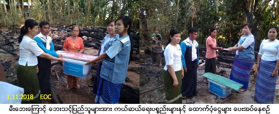 လူမှုဝန်ထမ်း၊ ကယ်ဆယ်ရေးနှင့် ပြန်လည်နေရာချထားရေးဝန်ကြီးဌာန၊ ဘေးအန္တရာယ်ဆိုင်ရာစီမံ ခန့်ခွဲမှုဦးစီးဌာန၊ တနင်္သာရီတိုင်းဒေသကြီးဦးစီးမှူးရုံးမှ တာဝန်ရှိသူများသည် သရက်ချောင်းမြို့နယ်၊ ဂုံညှင်းဆိပ်ကျေးရွာ၌ (၁-၁၁-၂၀၁၈) ရက်နေ့တွင် ဖြစ်ပွားခဲ့သောမီးဘေးကြောင့် အိမ်ခြေ (၃) လုံး၊ အိမ်ထောင်စု (၃) စုမှလူဦးရေ (၁၉) ဦး ဘေးသင့်ခဲ့ရာ အဆိုပါဘေးသင့် ပြည်သူများအတွက် ကယ်ဆယ်ရေးပစ္စည်း (၁၆) မျိုး (၃) အိမ်ထောင်စုစာ၊ အိမ်ဆောက်ပစ္စည်းဖိုးထောက်ပံ့ငွေ (၃၀၀,၀၀၀/-) ကျပ်၊ လူဦးရေစုစုပေါင်း (၁၉) ဦးအတွက် ဆန်ရိက္ခာဖိုးထောက်ပံ့ငွေ (၃၁,၅၀၀/-) ကျပ်အားလည်းကောင်း၊ မီးတားအဖြစ်ကြိုတင်ဖျက်ဆီးခဲ့သော နေအိမ် (၂) လုံးမှ အိမ်ထောင်စု (၂) စုအတွက် ကယ်ဆယ်ရေးပစ္စည်း (၁၀) မျိုး၊ အိမ်ဆောက်ပစ္စည်းဖိုးထောက်ပံ့ငွေ (၂၀၀,၀၀၀/-) ကျပ်အား လည်းကောင်း (၁-၁၁-၂၀၁၈) ရက်နေ့၊ (၁၆း၀၀) အချိန်တွင် သွားရောက်ထောက်ပံ့ပေးအပ်ခဲ့ပါကြောင်း သတင်းရရှိပါသည်။