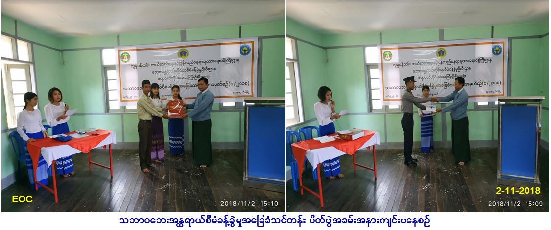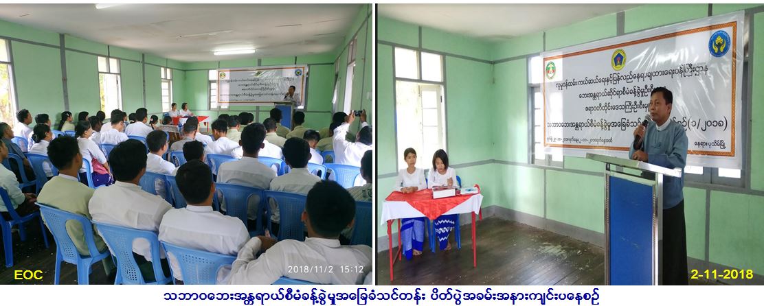 လူမှုဝန်ထမ်း၊ ကယ်ဆယ်ရေးနှင့်ပြန်လည်နေရာ ချထားရေးဝန်ကြီးဌာန၊ ဘေးအန္တရာယ်ဆိုင်ရာ စီမံခန့်ခွဲမှုဦးစီးဌာန၊ ဧရာဝတီတိုင်းဒေသကြီး ဦးစီးမှူးရုံးမှ ကြီးမှူးကျင်းပသည့် “သဘာဝဘေး အန္တရာယ်စီမံခန့်ခွဲမှုအခြေခံသင်တန်းအမှတ်စဉ် (၁/၂၀၁၈)” ပိတ်ပွဲအခမ်းအနားအား (၂-၁၁-၂၀၁၈)ရက်နေ့ (၁၅းဝဝ)နာရီအချိန်၌ ကိုးသိန်း အားကစားကွင်းသင်တန်းဆောင်ခန်းမ၌ ကျင်းပပြုလုပ်ခဲ့ရာ ဘေးအန္တရာယ်ဆိုင်ရာ စီမံခန့်ခွဲမှုဦးစီးဌာန၊ ဧရာဝတီတိုင်းဒေသကြီးဦးစီးမှူး ဦးသန်းစိုး၊ ညွှန်ကြားရေးမှူးမှ အမှာစကားပြောကြား၍ သင်တန်းဆင်းလက်မှတ်များချီးမြှင့်ပေးအပ်ခဲ့ပါသည်။ အဆိုပါ သင်တန်းအား ပုသိမ်ခရိုင်အတွင်းရှိ မြို့နယ်(၇)မြို့နယ်မှ သင်တန်းသား၊ သင်တန်းသူ (၅ဝ)ဦးဖြင့် (၂၉.၁၀.၂၀၁၈) ရက်နေ့မှ (၂.၁၁.၂၀၁၈)ရက်နေ့အထိ သင်တန်းကာလ (၅)ရက်ကြာ ဖွင့်လှစ်ခဲ့ကြောင်း သတင်းရရှိပါသည်။