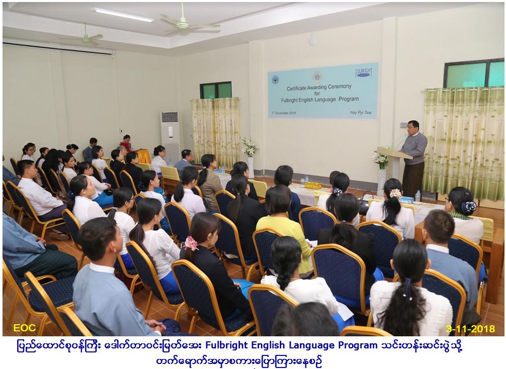 လူမှုဝန်ထမ်း၊ ကယ်ဆယ်ရေးနှင့် ပြန်လည်နေရာချထားရေးဝန်ကြီးဌာန၊ ဘေးအန္တရာယ်ဆိုင်ရာစီမံခန့်ခွဲမှုဦးစီးဌာနနှင့် အမေရိကန်နိုင်ငံအစိုးရ၊ နိုင်ငံခြားရေးဝန်ကြီးဌာနတို့ ပူးပေါင်းဖွင့်လှစ်သည့် Fulbright English Language Program သင်တန်းဆင်း လက်မှတ်ပေးအပ်သည့် အခမ်းအနားကို ယနေ့နံနက်ပိုင်းတွင် လူမှုဝန်ထမ်း၊ ကယ်ဆယ်ရေးနှင့် ပြန်လည်နေရာချထားရေး ဝန်ကြီးဌာန၊ ဘေးအန္တရာယ်ဆိုင်ရာစီမံခန့်ခွဲမှု ဦးစီးဌာန၊ အရေးပေါ် အခြေအနေစီမံခန့်ခွဲမှုဗဟိုဌာန (EOC) အစည်းအဝေးခန်းမ၌ ကျင်းပပြုလုပ်ခဲ့ရာ ပြည်ထောင်စုဝန်ကြီး၊ ဒေါက်တာဝင်းမြတ်အေး တက်ရောက်၍ သင်တန်းဆင်းပွဲနှင့်စပ်လျဉ်း သည့် အမှာစကား ပြောကြားခဲ့ပါသည်။