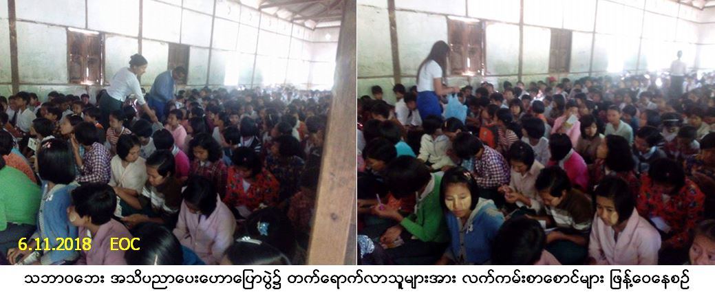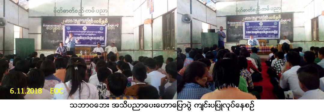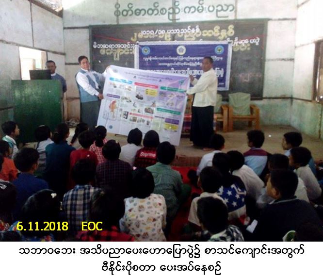 လူမှုဝန်ထမ်း၊ ကယ်ဆယ်ရေးနှင့် ပြန်လည်နေရာချထားရေးဝန်ကြီးဌာန၊ ဘေးအန္တရာယ်ဆိုင်ရာ စီမံခန့်ခွဲ မှုဦးစီးဌာန၊ ပြည်ထောင်စုနယ်မြေ၊ နေပြည်တော်တိုင်းဦးစီးမှူးရုံးမှ တာဝန်ရှိသူများသည် တပ်ကုန်းမြို့နယ်၊ ညောင်လွန့် (အ.ထ.က) စာသင်ကျောင်း၌ (၆-၁၁-၂၀၁၈) ရက်နေ့၊ (၁၀း၀၀) နာရီမှ (၁၁း၃၀) နာရီအချိန်ထိ သဘာဝဘေး အသိပညာပေးဟောပြောပွဲ ကျင်းပပြုလုပ်ခဲ့ပါသည်။ အဆိုပါအခမ်းအနား၌ ကျောင်းသား/ကျောင်းသူ (၄၈၂) ဦးတက်ရောက်ခဲ့ပြီး တက်ရောက်လာသူများအား လက်ကမ်းစာစောင်များနှင့် ဘောပင်များဖြန့်ဝေခဲ့ကာ စာသင်ကျောင်းအတွက် ဗီနိုင်းပိုစတာ ပေးအပ်ခဲ့ပါကြောင်း သတင်းရရှိပါသည်။