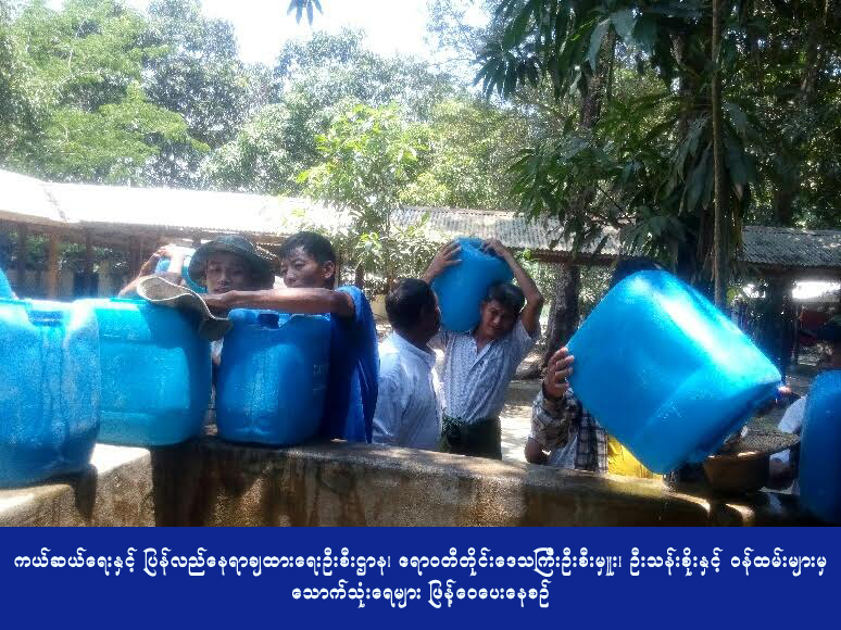 ၂၀-၄-၂၀၁၆ ရက်နေ့တွင် လူမှုဝန်ထမ်း၊ ကယ်ဆယ်ရေးနှင့်ပြန်လည်နေရာချထားရေးဝန်ကြီးဌာန၊ ကယ်ဆယ်ရေးနှင့်ပြန်လည်နေရာချထားရေးဦးစီးဌာန၊ ဧရာဝတီတိုင်းဒေသကြီးဦးစီးမှူး ဦးသန်းစိုး၊ ညွှန်ကြားရေးမှူးမှ ဦးဆောင်၍ မီးသတ်ဦးစီးဌာနနှင့် ပူးပေါင်းပြီး မီးသတ်ကားဂါလံ(၁၆၀၀)ပါရေသယ်ယာဉ် ၂ စီး၊ ၈ ဂါလံပါပုံး (၅၀) ဂါလံ (၄၀၀) စုစုပေါင်းဂါလံ (၃၆၀၀ ) အား သောက်ရေပြတ်လပ်သည့် ကျေးရွာသူကျေးရွာသားများအား သောက်သုံးရေဖြန့်ဝေခဲ့ကြောင်း သတင်းရရှိပါသည်။