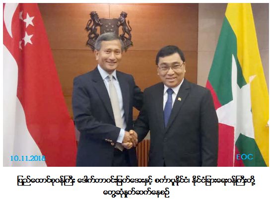 (၉.၁၁.၂၀၁၈)ရက်နေ့၊ နံနက်ပိုင်းတွင် စင်္ကာပူနိုင်ငံ၊ နိုင်ငံခြားရေးဝန်ကြီးဌာန ဧည့်ခန်းမ ဆောင်၌ လူမှုဝန်ထမ်း၊ ကယ်ဆယ်ရေးနှင့် ပြန်လည်နေရာချထားရေးဝန်ကြီးဌာန ပြည်ထောင်စု ဝန်ကြီး ဒေါက်တာဝင်းမြတ်အေးနှင့် စင်္ကာပူနိုင်ငံ၊ နိုင်ငံခြားရေးဝန်ကြီး H.E. Dr. Vivian Balakrishnan တို့တွေ့ဆုံခဲ့ပါသည်။