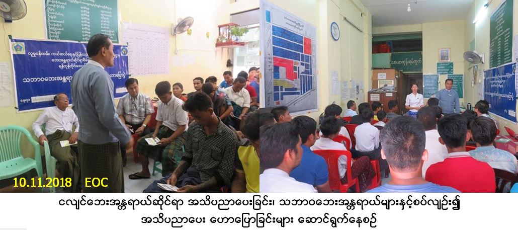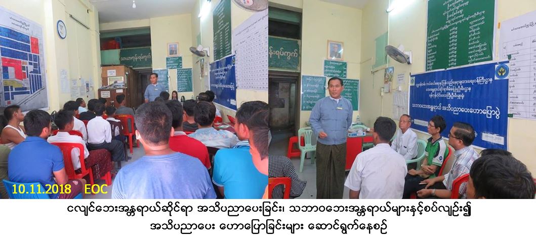လူမှုဝန်ထမ်း၊ ကယ်ဆယ်ရေးနှင့် ပြန်လည်နေရာချထားရေးဝန်ကြီးဌာန၊ ဘေးအန္တရာယ် ဆိုင်ရာစီမံခန့်ခွဲ မှုဦးစီးဌာန၊ ရန်ကုန်တိုင်းဒေသကြီးဦးစီးမှူးရုံးမှ တာဝန်ရှိသူများသည် မင်္ဂလာတောင်ညွန့်မြို့နယ်၊ သာယာကုန်းရပ်ကွက်၊ ရပ်ကွက်အုပ်ချုပ်ရေးမှူးရုံး၌ (၁၀-၁၁-၂၀၁၈) ရက်နေ့၊ နံနက် (၁၀း၀၀) နာရီအချိန်တွင် ပြည်သူလူထု (၁၀၀) ဦးအား ငလျင်ဘေးအန္တရာယ်ဆိုင်ရာအသိပညာပေးခြင်း၊ သဘာဝဘေးအန္တရာယ်များနှင့် စပ်လျဉ်း၍အသိပညာ ပေးဟောပြောခြင်းများဆောင်ရွက်ခဲ့ပြီး တက်ရောက်လာသူများအား သဘာဝဘေး အသိပညာပေး လက်ကမ်း စာစောင်များဖြန့်ဝေခဲ့ပါကြောင်း သတင်းရရှိပါသည်။