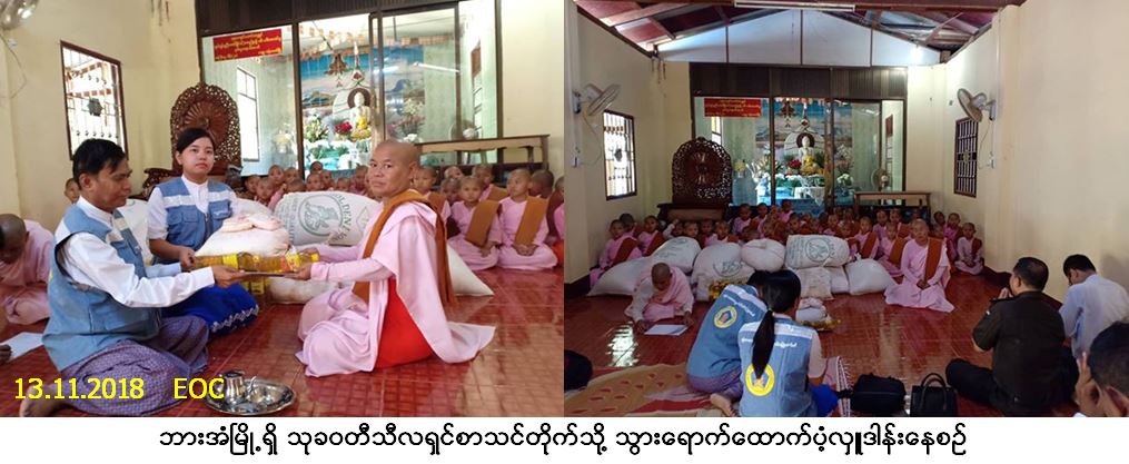 လူမှုဝန်ထမ်း၊ ကယ်ဆယ်ရေးနှင့် ပြန်လည်နေရာချထားရေးဝန်ကြီးဌာန၊ ဘေးအန္တရာယ်ဆိုင်ရာစီမံ ခန့်ခွဲမှုဦးစီးဌာန၊ ကရင်ပြည်နယ်ဦးစီးမှူးရုံးမှ တာဝန်ရှိသူများသည် ဘားအံမြို့၊ လှာကဒေါင်ကျေးရွာရှိ သုခဝတီသီလရှင် စာသင်တိုက်သို့ ဆန် (၁) တင်းခွဲ (၁၀) အိတ်၊ ဆီ (ဝ.၅) လီတာ (၂၇) ဗူး၊ ဆား (၁၀) ပိဿ (၂) အိတ်တို့ကို (၁၃- ၁၁-၂၀၁၈) ရက်နေ့၊ (၁၁း၃၀) နာရီအချိန်တွင် သွားရောက်ထောက်ပံ လှူဒါန်းခဲ့ပါကြောင်း သတင်းရရှိပါသည်။