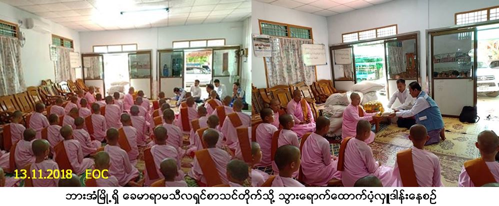 လူမှုဝန်ထမ်း၊ ကယ်ဆယ်ရေးနှင့် ပြန်လည်နေရာချထားရေးဝန်ကြီးဌာန၊ ဘေးအန္တရာယ်ဆိုင်ရာစီမံ ခန့်ခွဲမှုဦးစီးဌာန၊ ကရင်ပြည်နယ်ဦးစီးမှူးရုံးမှ တာဝန်ရှိသူများသည် ဘားအံမြို့၊ လှာကာကျေးရွာ၊ အမှတ် (၂) ဘီလပ်မြေစက်ရုံ အနီးရှိ ခေမာရာမသီလရှင်စာသင်တိုက်သို့ ဆန် (၁) တင်းခွဲ (၁၁) အိတ်၊ ဆီ (ဝ.၅) လီတာ (၃၀) ဗူး၊ ဆား (၁၀) ပိဿ (၁) အိတ်တို့ကို (၁၃-၁၁-၂၀၁၈) ရက်နေ့၊ နေ့လယ် (၂း၀၀) အချိန်တွင် သွားရောက် ထောက်ပံ့လှူဒါန်းခဲ့ပါကြောင်း သတင်းရရှိပါသည်။